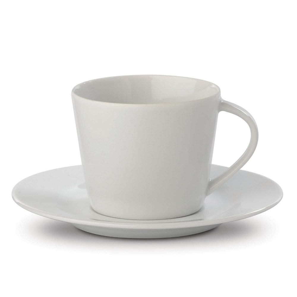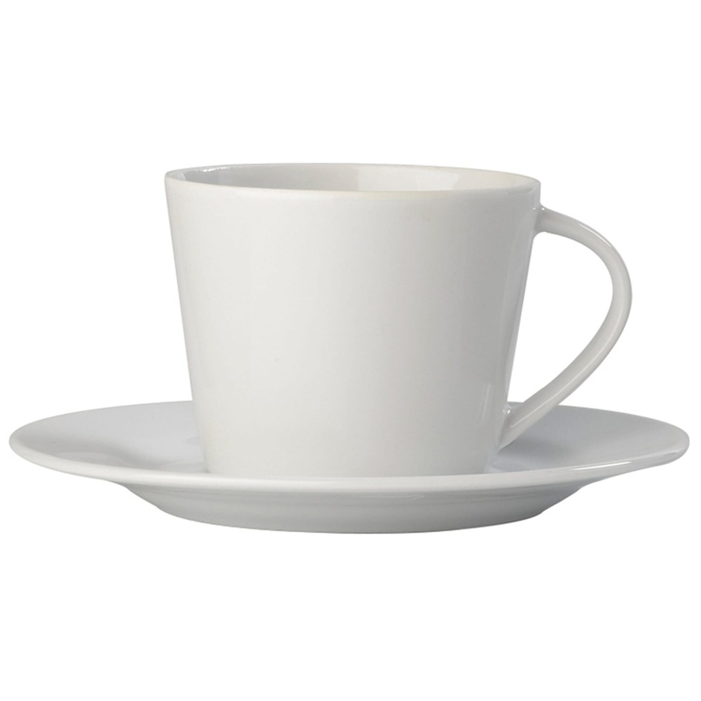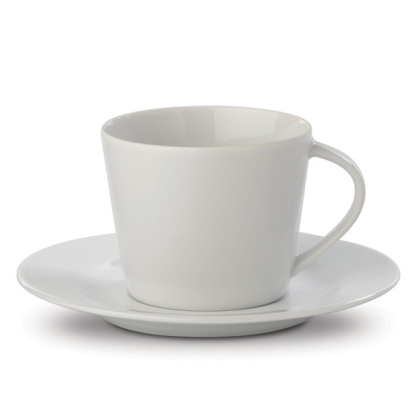 Kop en schotel van porselein. Strak vormgegeven in conisch model. Hoogwaardige kwaliteit, geproduceerd in Europa. Past er goed bij de mok Nice en espresso kop en schotel Firenze.