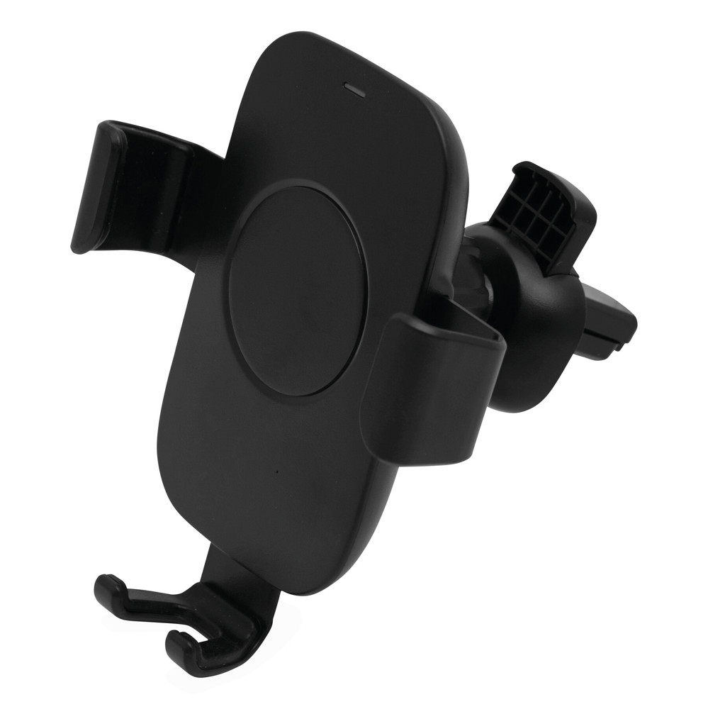Telefoonhouder IN CAR: voor de meeste gangbare smartphones, met klem voor bevestiging aan ventilatieroosters (voor verschillende lamellendiktes), kogelgewricht voor optimale uitrichting, inductie-oplaadunit met geïntegreerde USB-kabel (1m.):