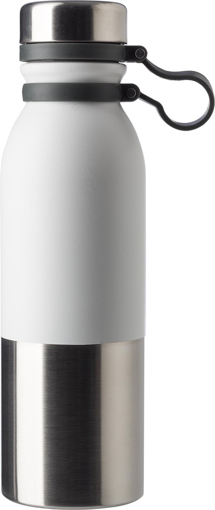 Roestvrijstalen dubbelwandige drinkfles (600 ml) met een siliconen band voor de dop. Verpakt in geschenkverpakking.