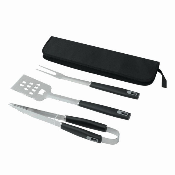 RVS-BBQ-bestel PRETTY BBQ: bestaande uit spatel, vork en tang, in stevige hoes met rits en draaglusmeer