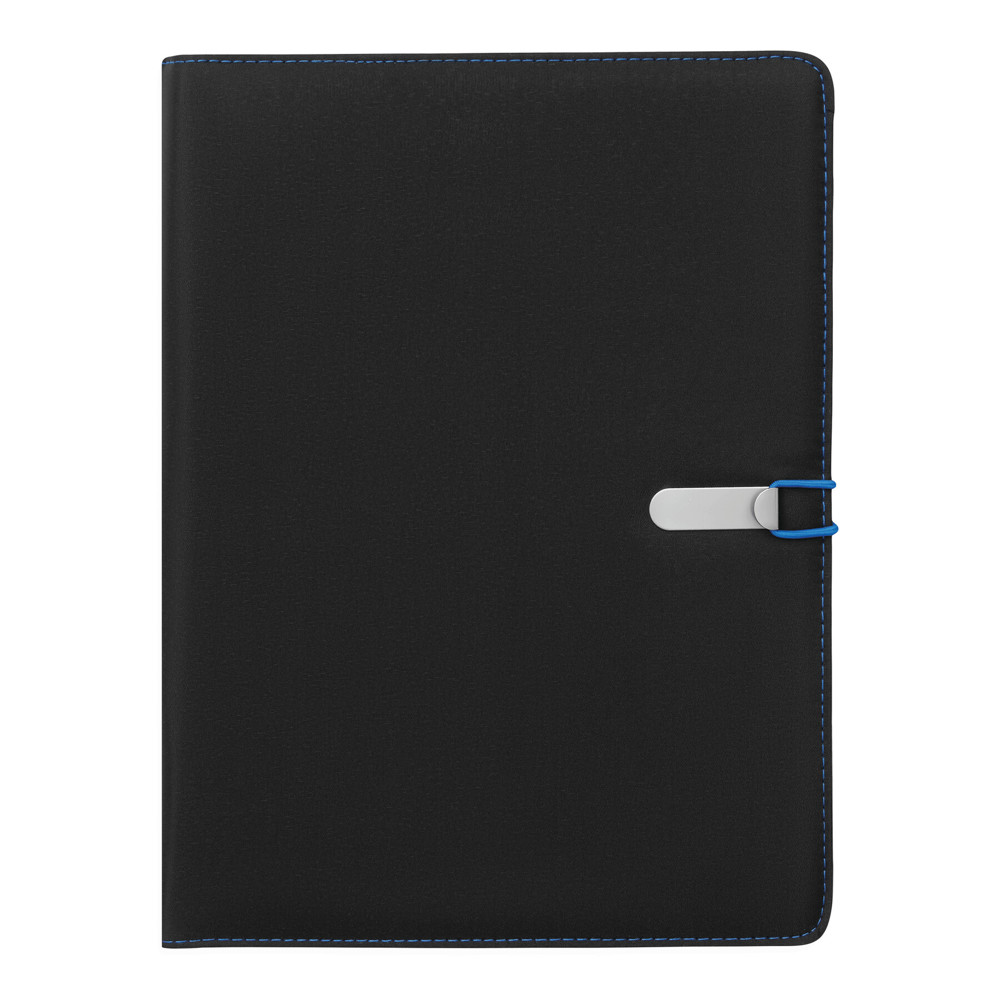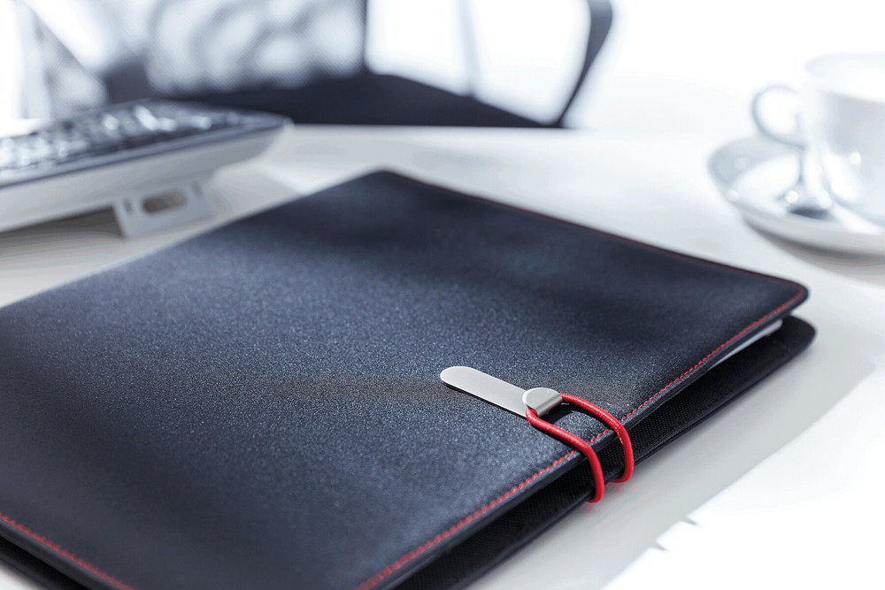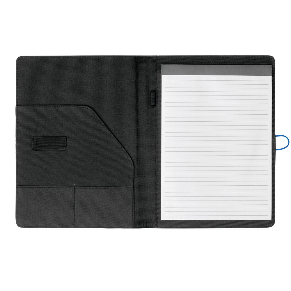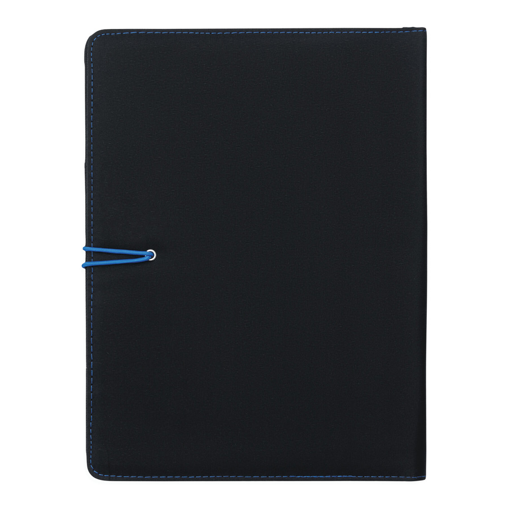 A4-schrijfmap SESSION van microfiber met schrijfblok, diverse opbergvakken, penhouder en een gekleurde elastische sluitband met metalen haak.