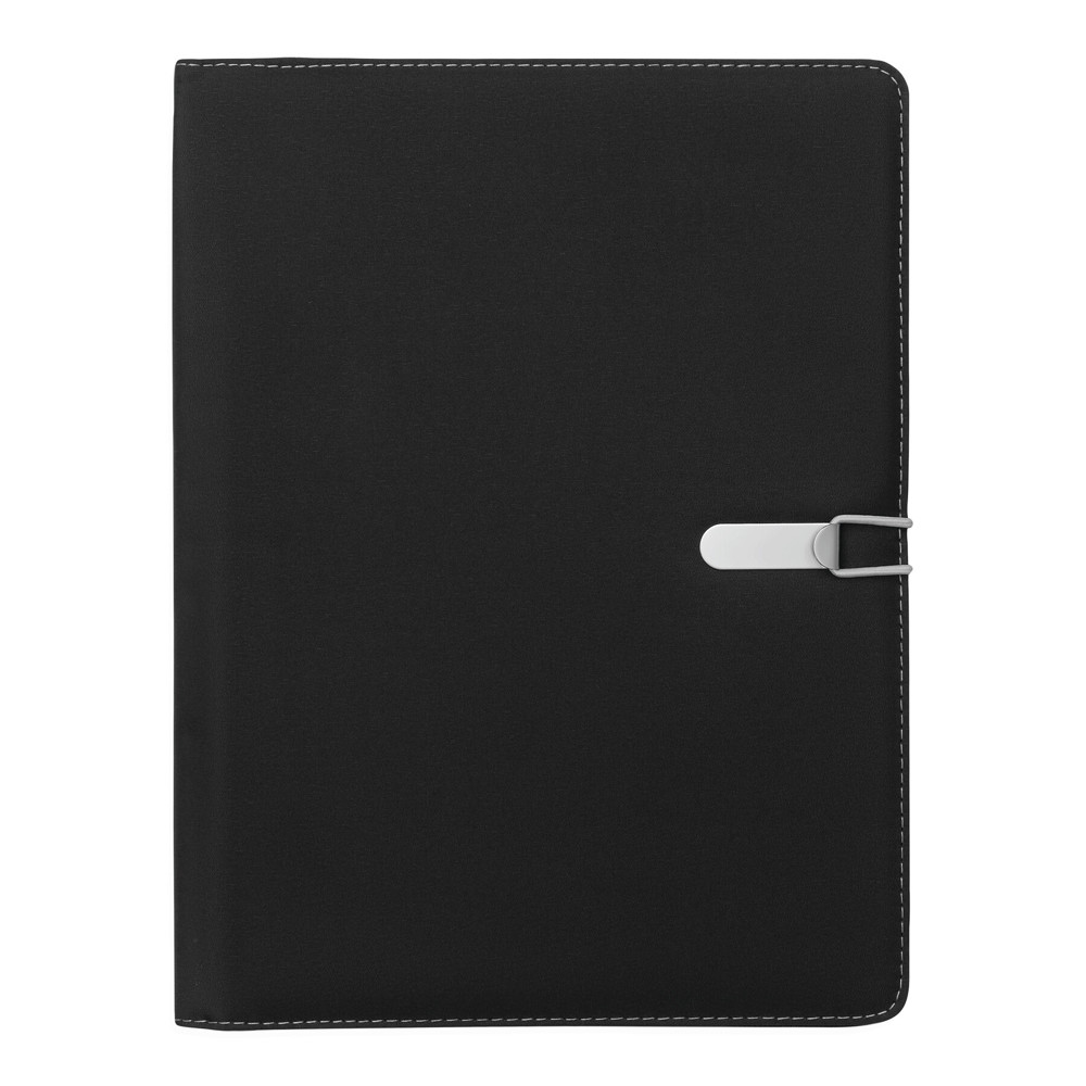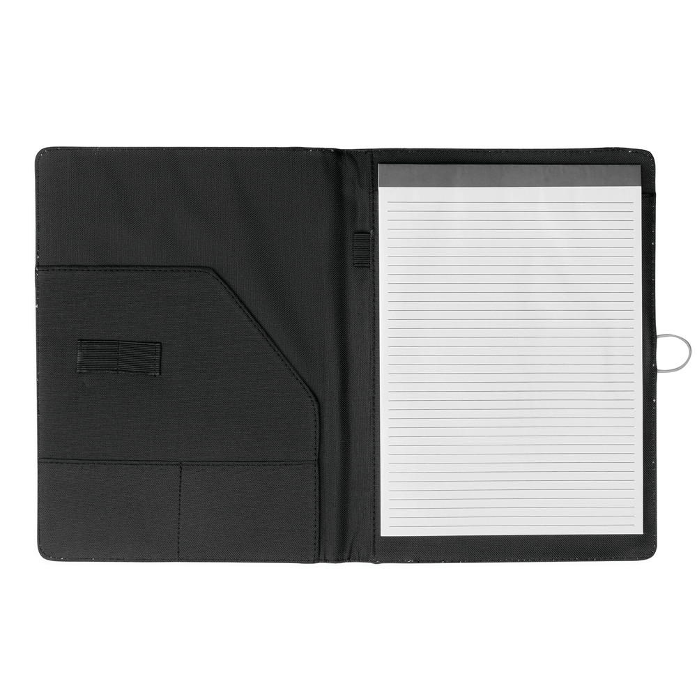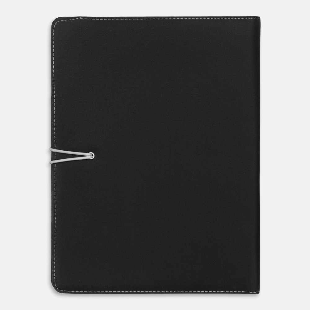 A4-schrijfmap SESSION van microfiber met schrijfblok, diverse opbergvakken, penhouder en een gekleurde elastische sluitband met metalen haak.