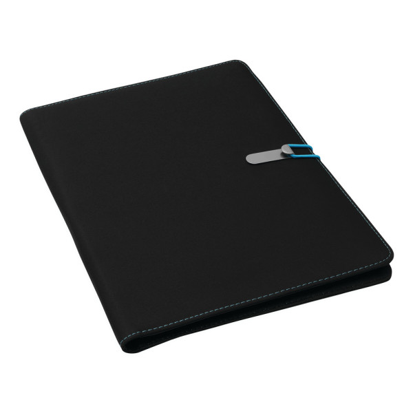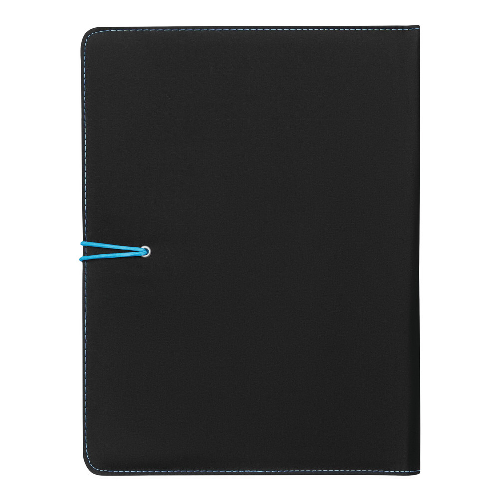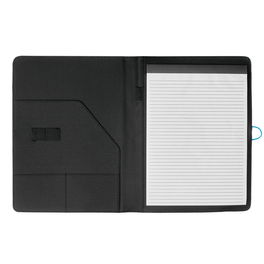 A4-schrijfmap SESSION van microfiber met schrijfblok, diverse opbergvakken, penhouder en een gekleurde elastische sluitband met metalen haak.