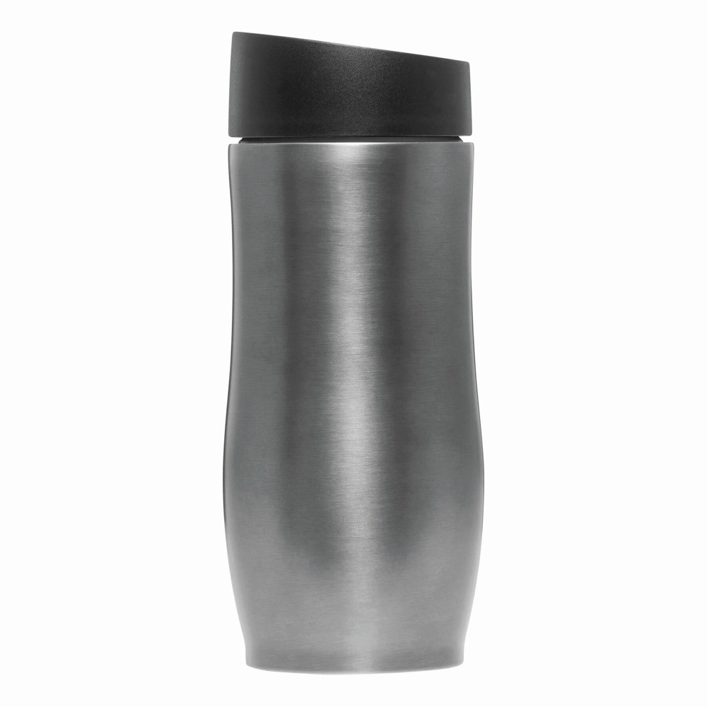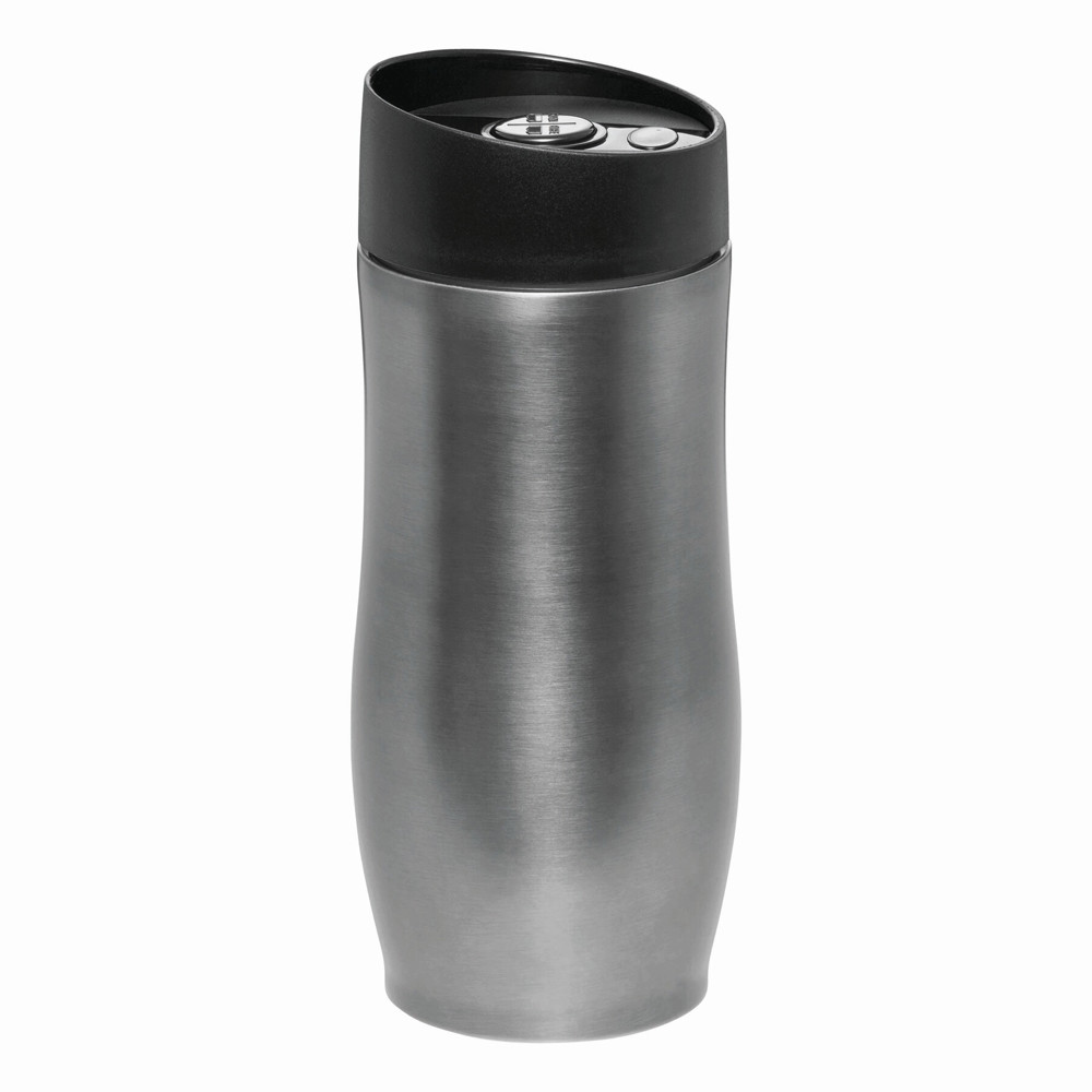 Dubbelwandige isoleerbeker van roestvrij staal CLASSICO met kunststof schroefdeksel, geïntegreerde drinktuit en inhoud van ca. 380 ml. Gummi onderzijde voor een goede stabiliteit.