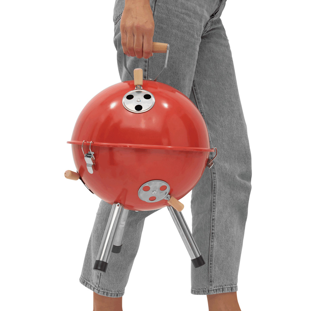 Tafelbarbecue COOKOUT van metaal. Deze BBQ heeft 2 ventilatiegaten, een uitneembare tray, rooster (Ø ca 29cm), afsluitbaar deksel met beluchtingsgaten en 3 poten met kunststof afwerking. Geleverd in geschenkdoos.