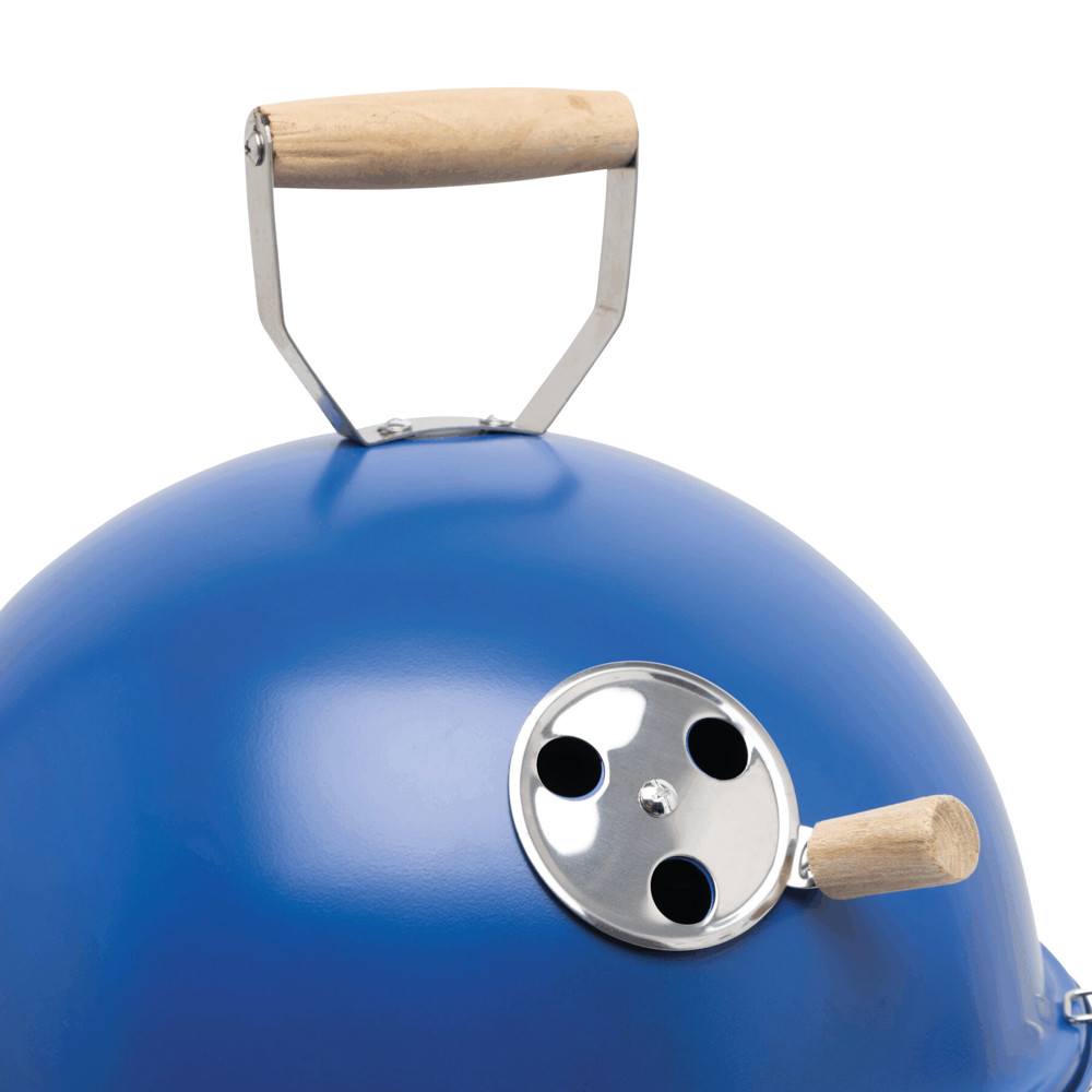 Tafelbarbecue COOKOUT van metaal. Deze BBQ heeft 2 ventilatiegaten, een uitneembare tray, rooster (Ø ca 29cm), afsluitbaar deksel met beluchtingsgaten en 3 poten met kunststof afwerking. Geleverd in geschenkdoos.