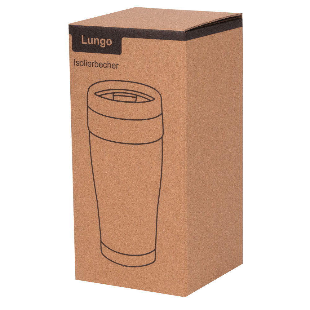 Dubbelwandige isoleerbeker LUNGO van roestvrij staal (buitenzijde RVS en binnenzijde kunststof) met schroefdeksel en geïntegreerde drinktuit. Inhoud ca. 400 ml.