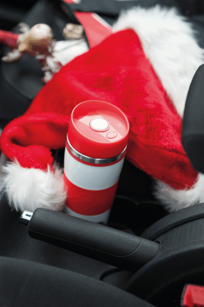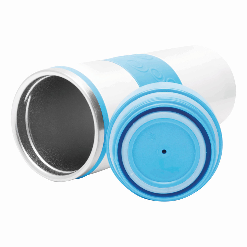 Dubbelwandige isoleerbeker ARABICA van roestvrijstaal met gekleurde rubbergrip. Gekleurd kunststof schroefdeksel met drukknopje om de geïntegreerde drinkopening te openen en sluiten. Onderkant voorzien van rubbervlak voor een betere stabiliteit. Inhoud ca. 400ml.