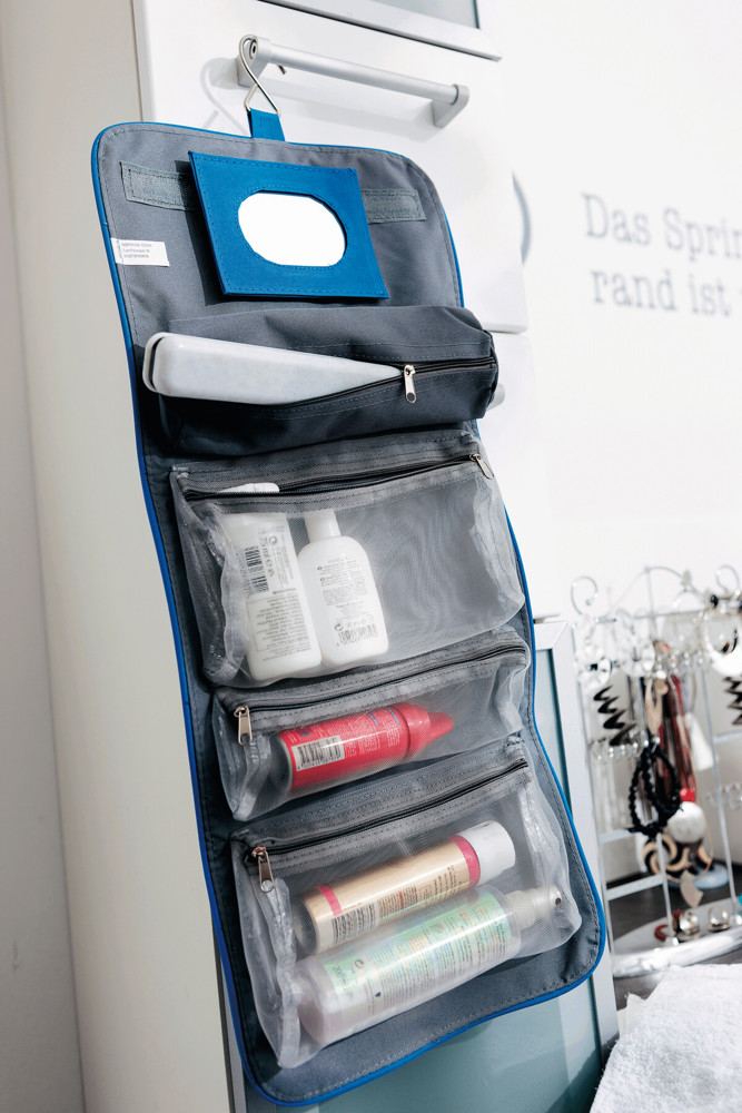 Toilettas STAR van 300D polyester met 5 middels rits afsluitbare compartimenten, afneembare spiegel, metalen haak en stevig handvat.