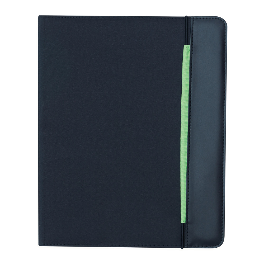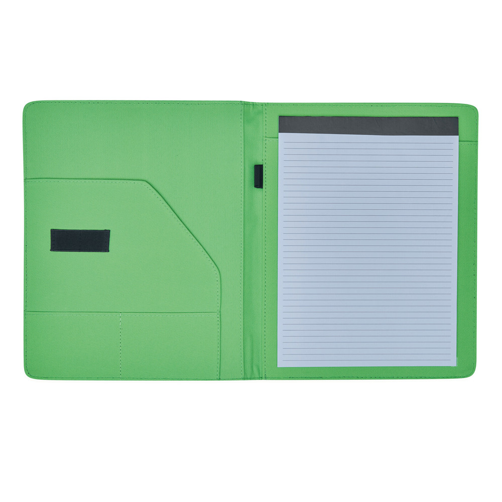 A4-portfolio YOUNG STAR van microfibre en 600D polyester met schrijfblok, penhouder, insteekvakken, elastische sluitband en gekleurde afwerking aan binnen- en buitenzijde.