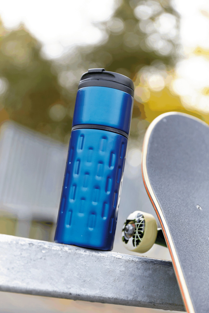 Opvallend gestylde isoleerbeker EXCLUSIVE LIQUID; RVS buitenzijde en kunststof binnenzijde, schroefdeksel met geïntegreerde uitklapbare drinktuit en foam onderzijde voor goede grip. Inhoud ca 400ml.