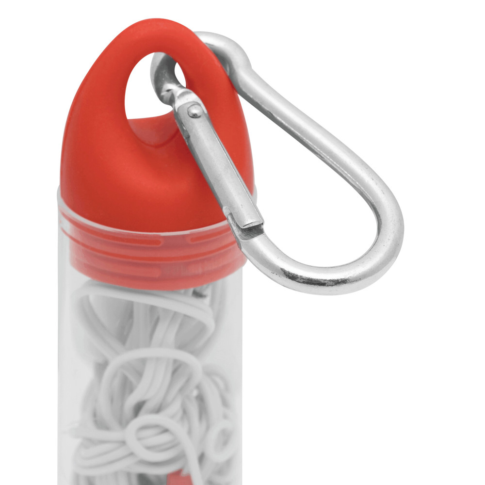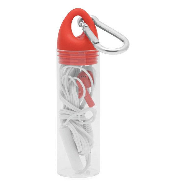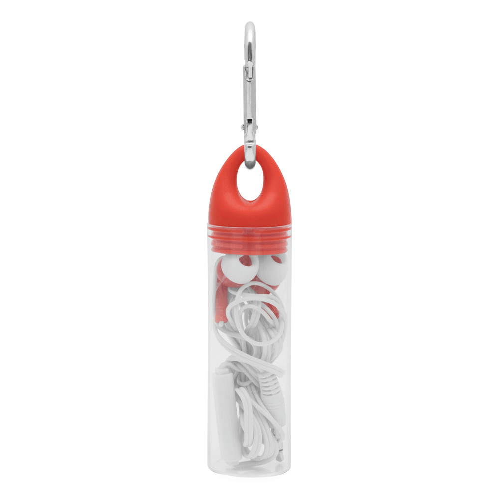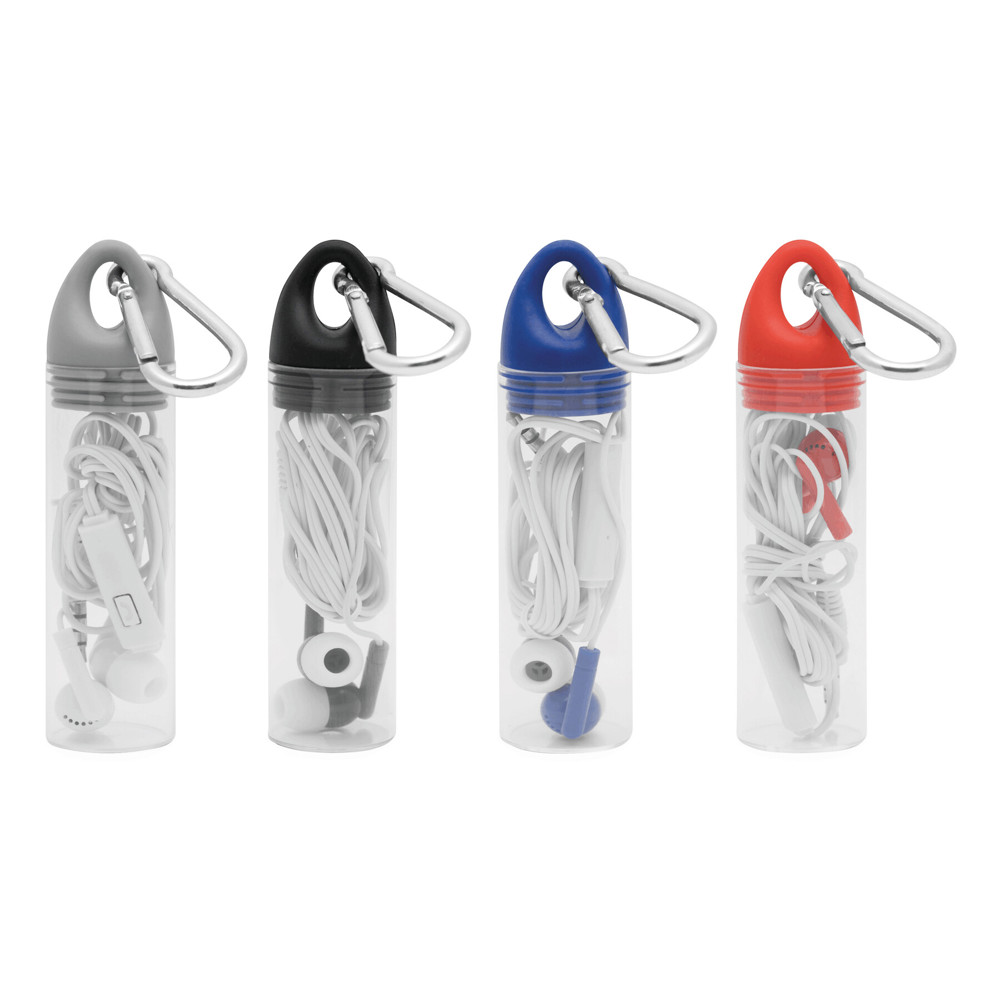 Oortelefoontjes LISTEN & TALK: incl. geintegreerde microfoon en knop voor telefoonopname, 3,5mm plug, kabellengte ca. 120 cm, in kunststof box met gekleurde dop en aluminium karabijnhaak.