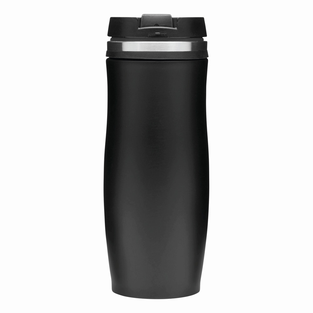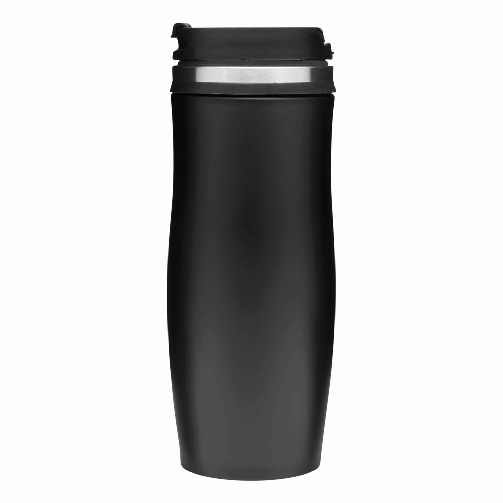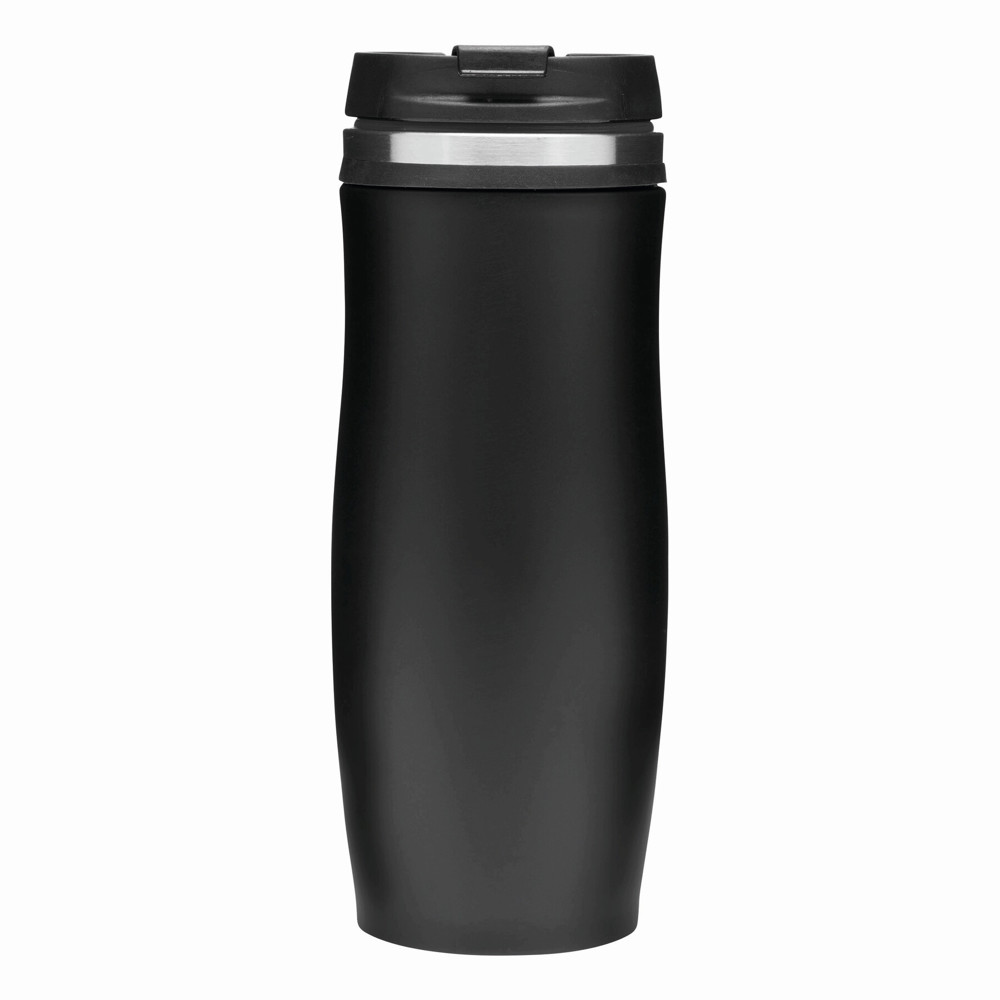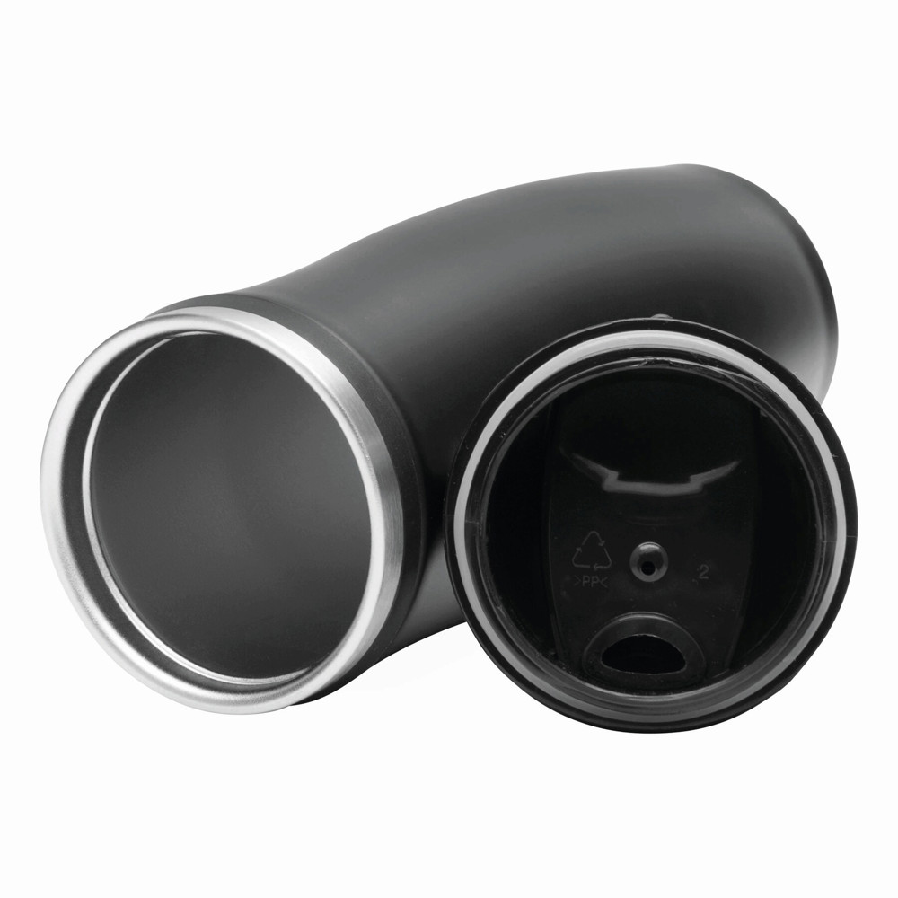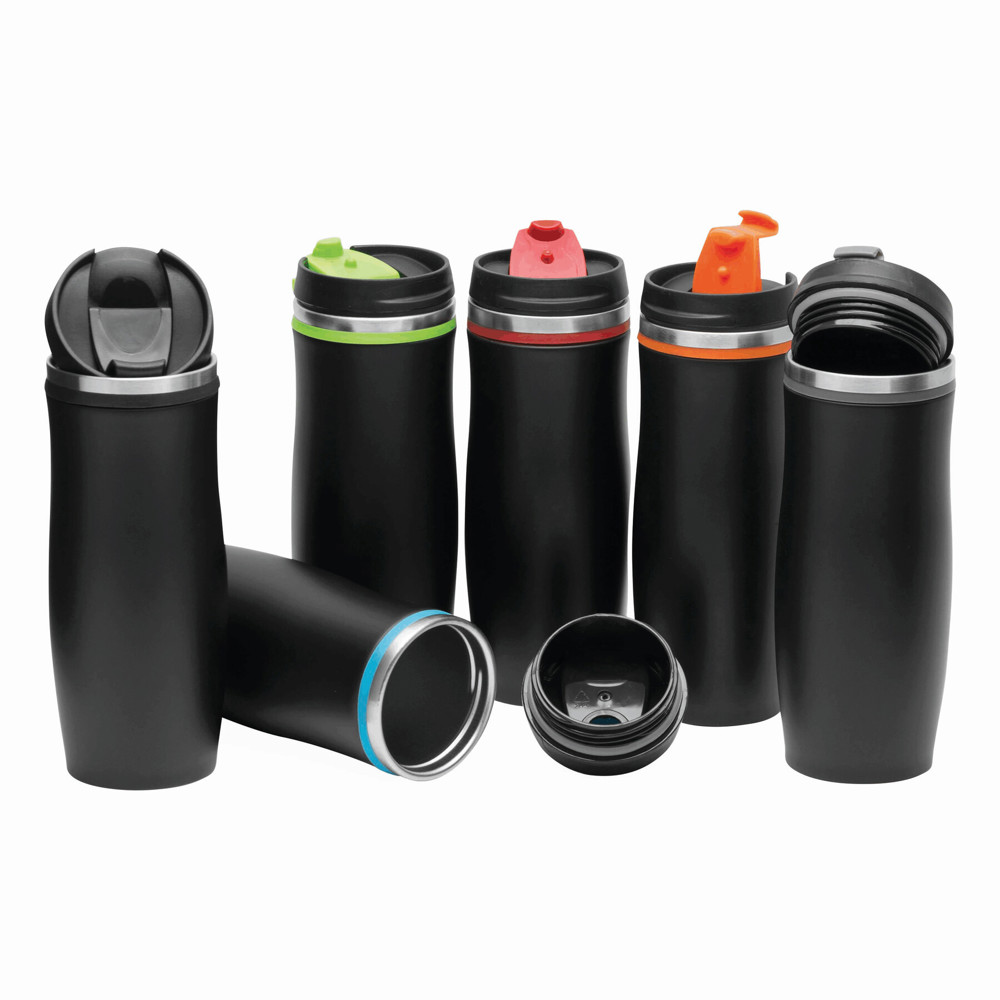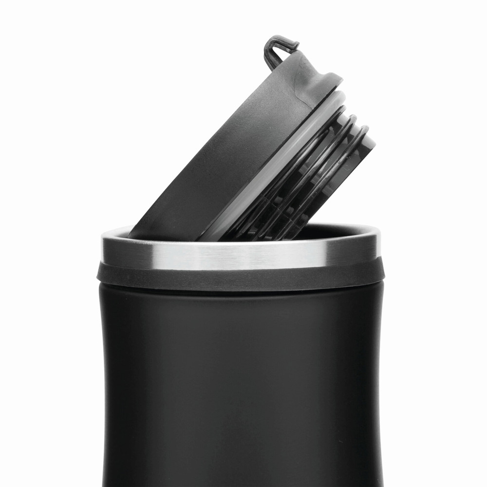 Dubbelwandige roestvrijstalen isoleerbeker DARK CREMA; met kunststof schroefdeksel en geïntegreerde uitklapbare drinktuit, gekleurde accenten en een foam onderzijde voor goede grip. Inhoud ca 400ml.