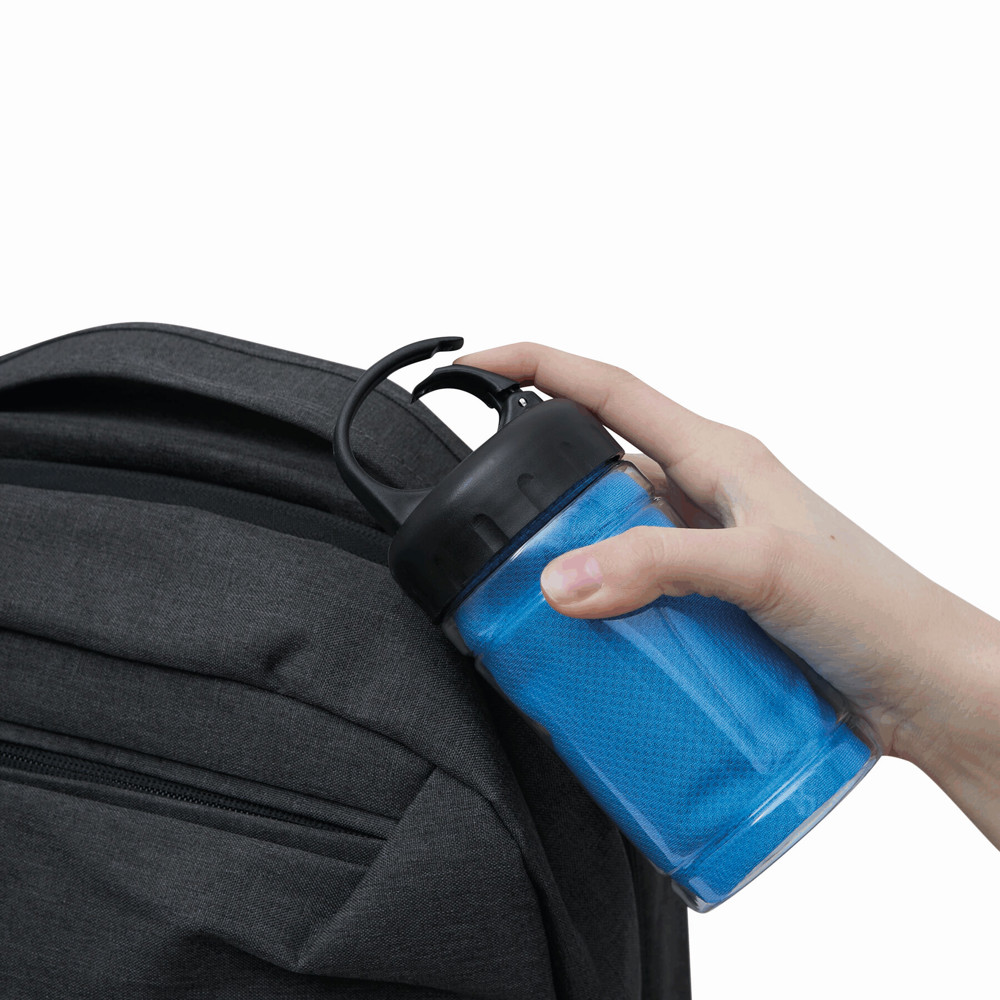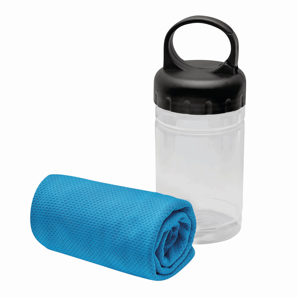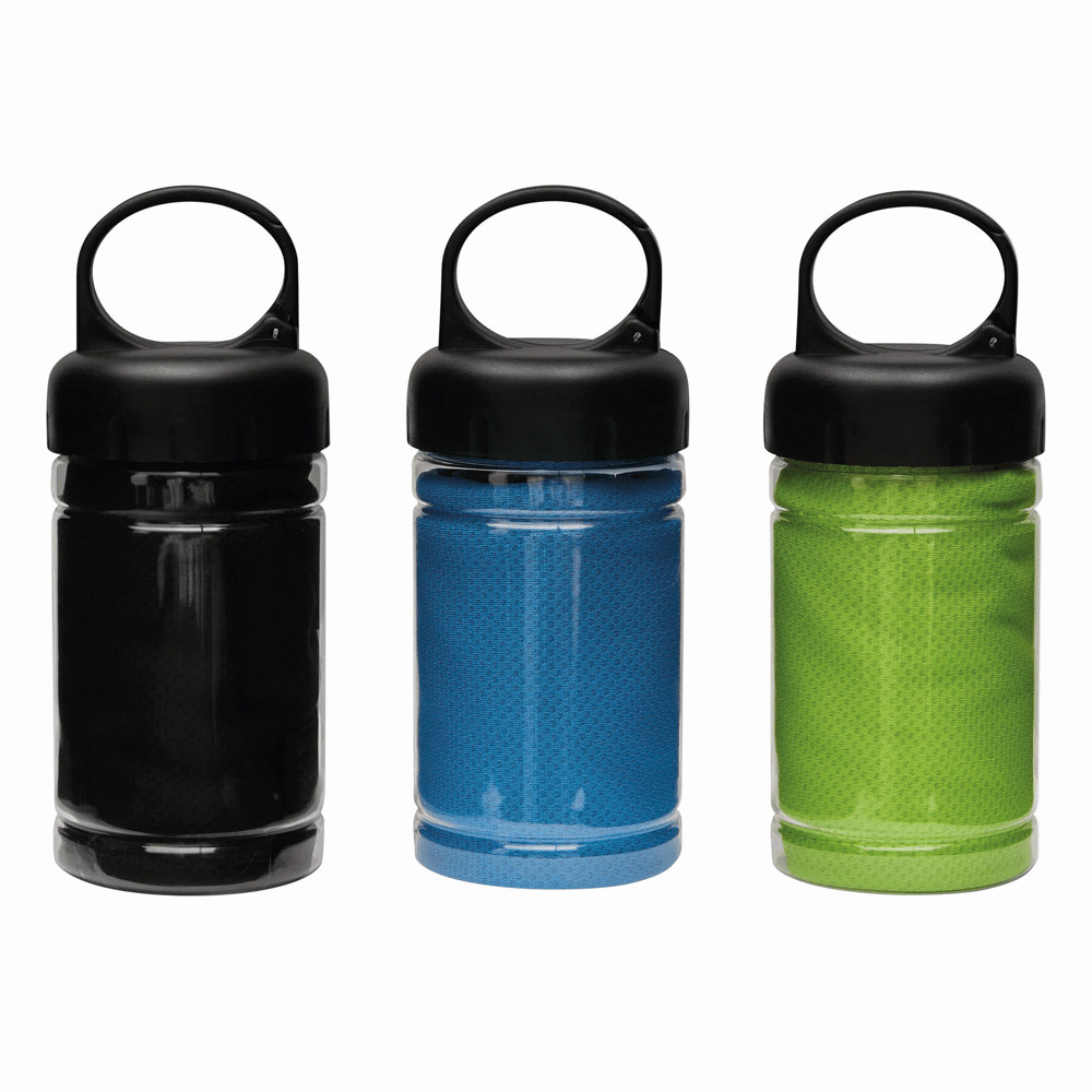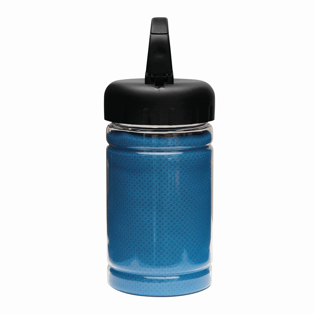 Koelhanddoek CHILLING: in transparante beker, met geïntegreerde zon-beschermingsfactor, voor lang koeleffect de handdoek met water bevochtigen of de beker vullen met water en goed schudden, deksel met karabijnhaak in kleur, ideaal voor fitness en sportactiviteiten