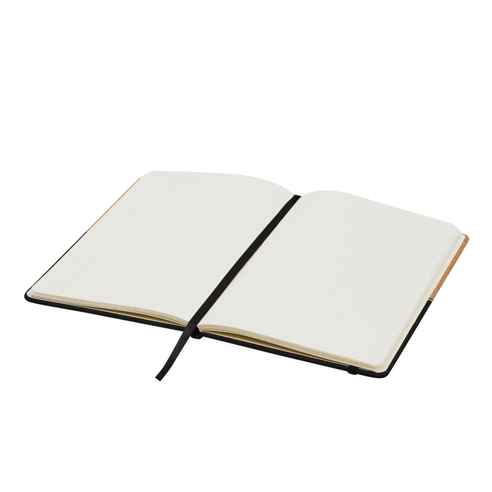 Notitieboek CORKY: in A5-formaat met afgeronde hoeken, elastische sluitband en geïntegreerde bladwijzer, 80 bladzijden stippenpapier, 70 g/m² - omslag van kurk.