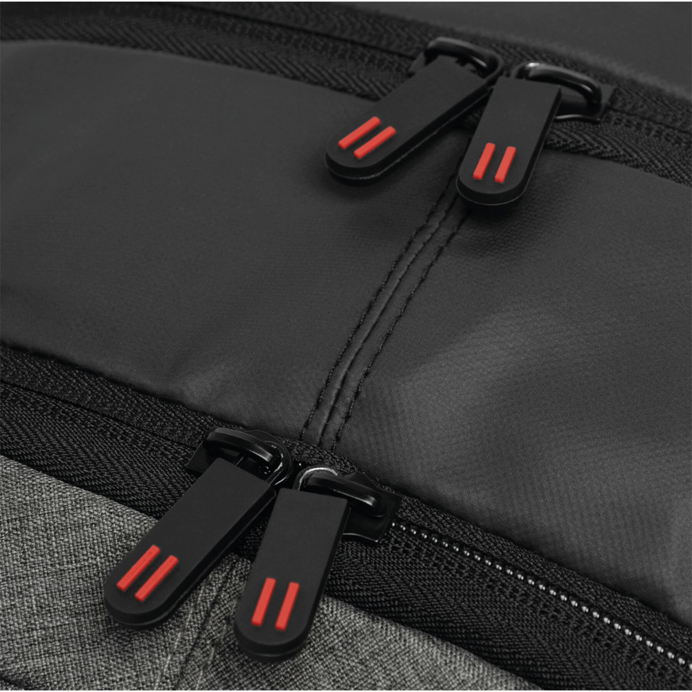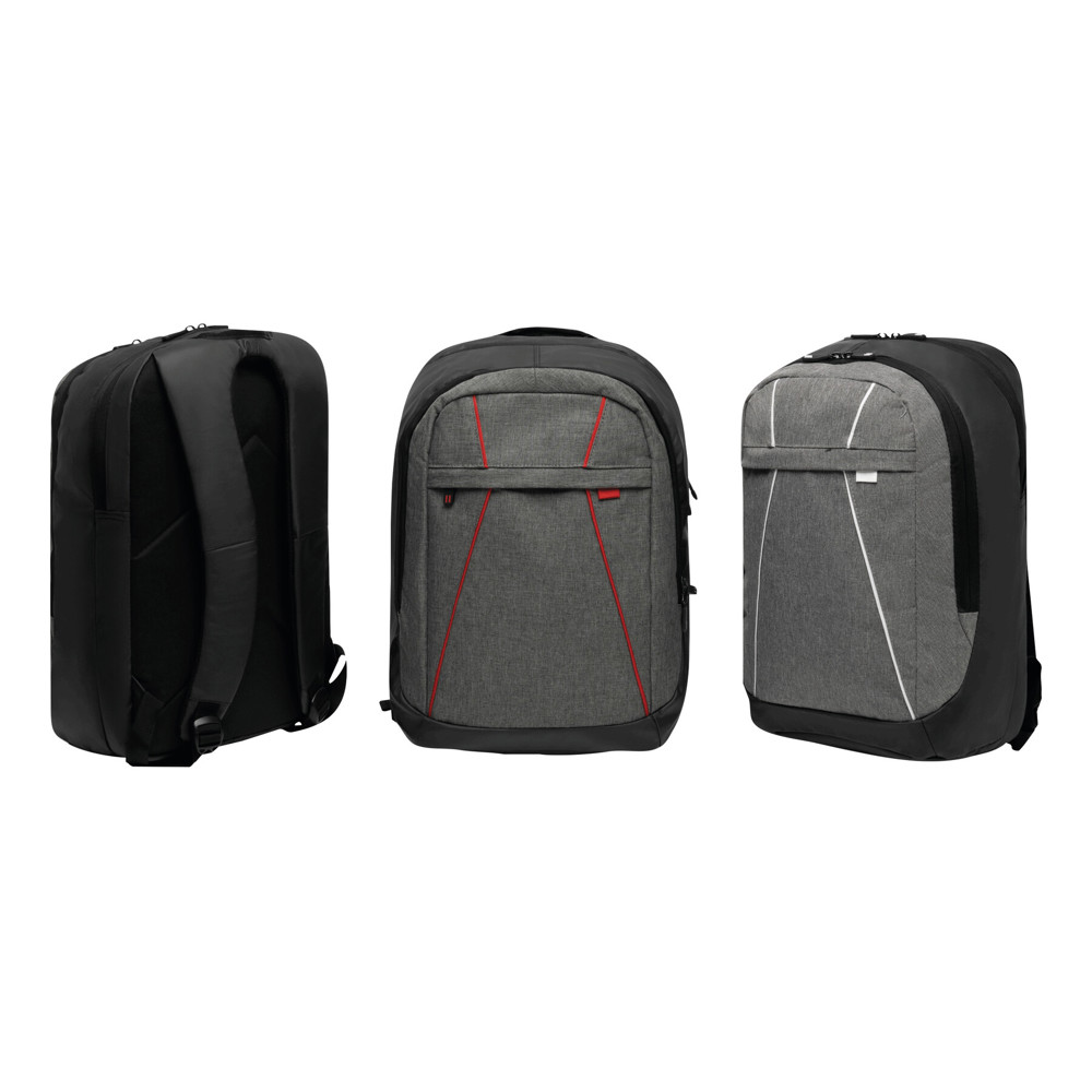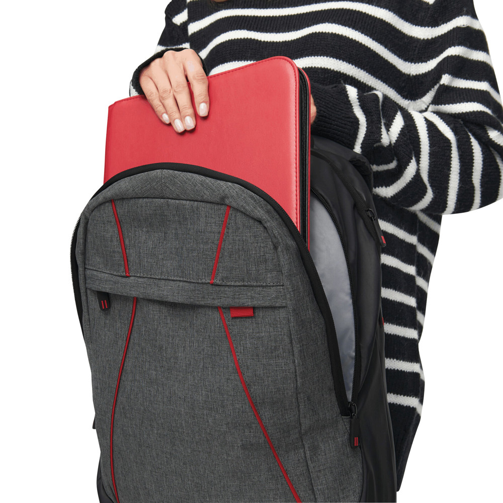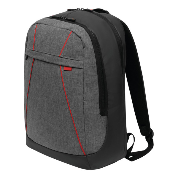 Rugtas SPLIT: 1 voorvak met rits, 2 hoofdvakken met rits, waarvan 1 met gefoamd notebookvak en 1 insteekvak , het andere hoofdvak met kleine organiser, handvat, gefoamde schouderbanden en rugpaneel