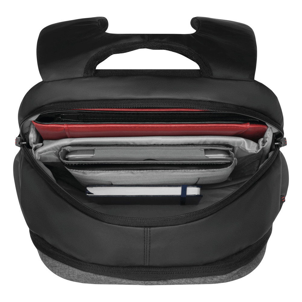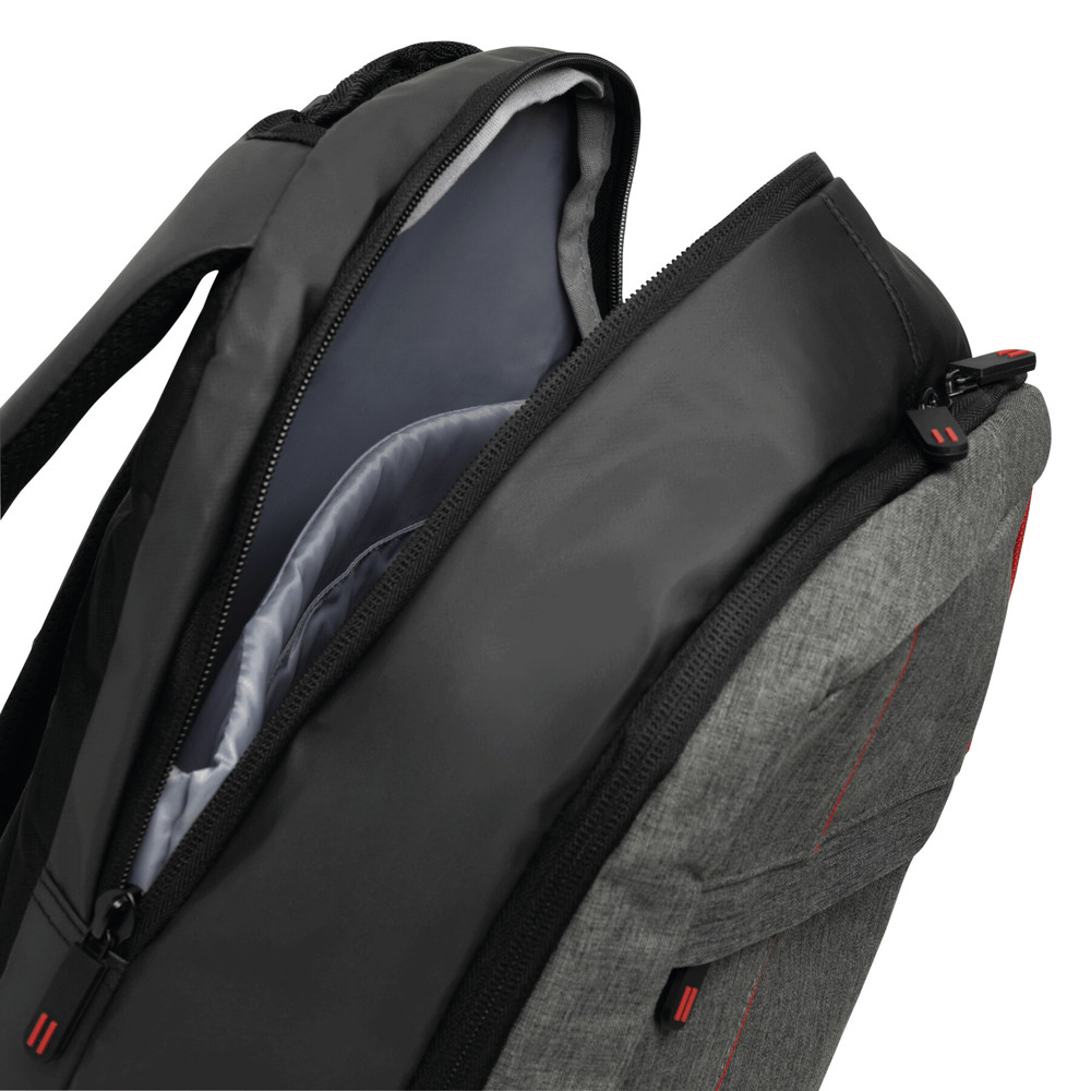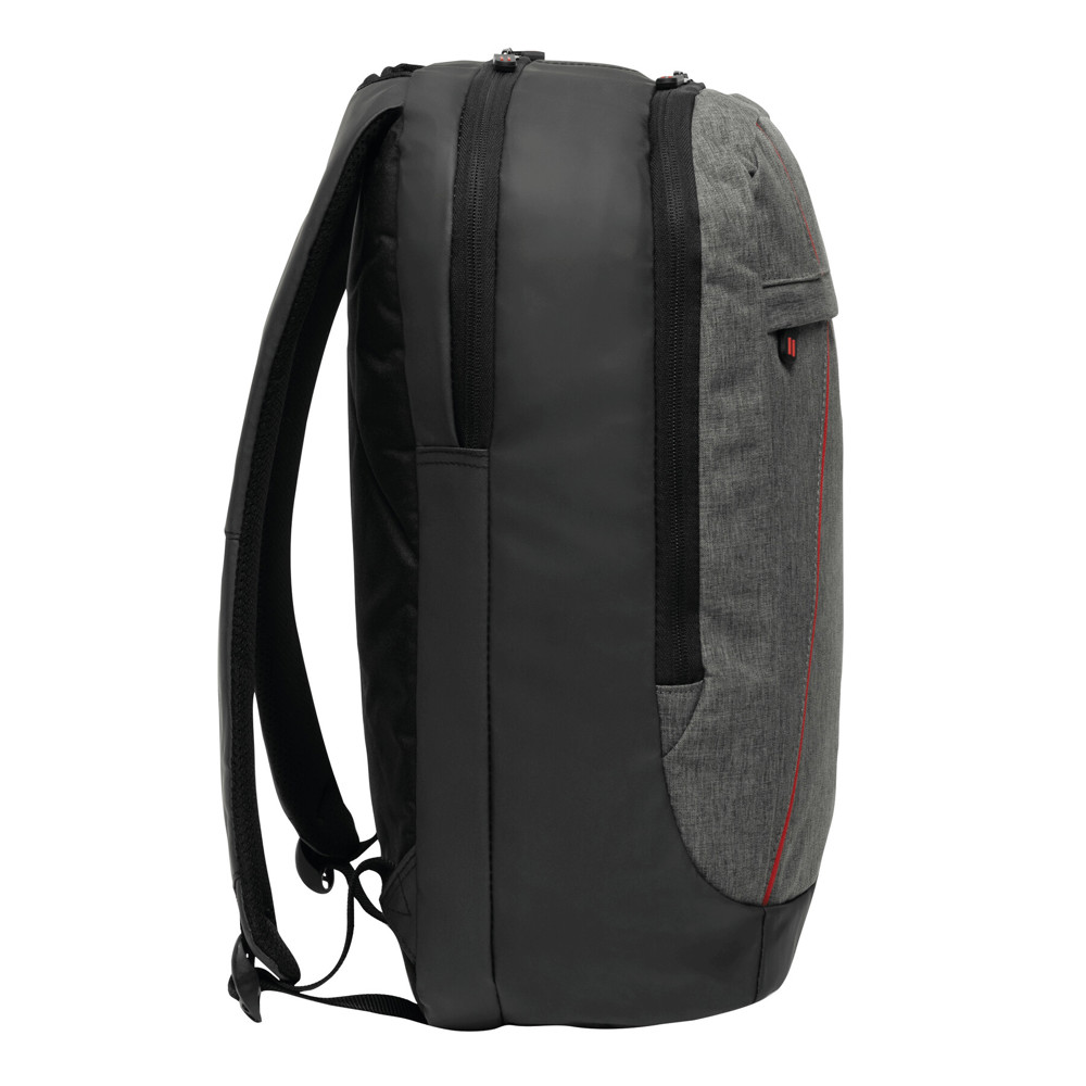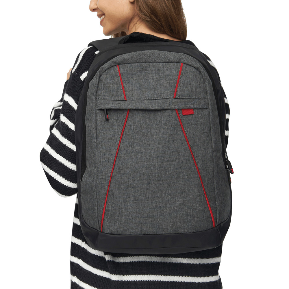 Rugtas SPLIT: 1 voorvak met rits, 2 hoofdvakken met rits, waarvan 1 met gefoamd notebookvak en 1 insteekvak , het andere hoofdvak met kleine organiser, handvat, gefoamde schouderbanden en rugpaneel