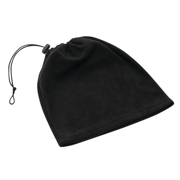 Muts/ sjaalcombinatie van fleece VARIOUS, door middel van trekkoord eenvoudig te veranderen van sjaal naar muts.