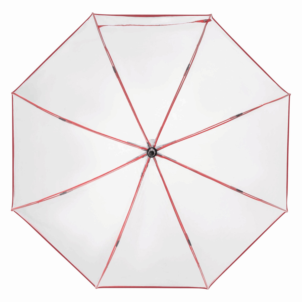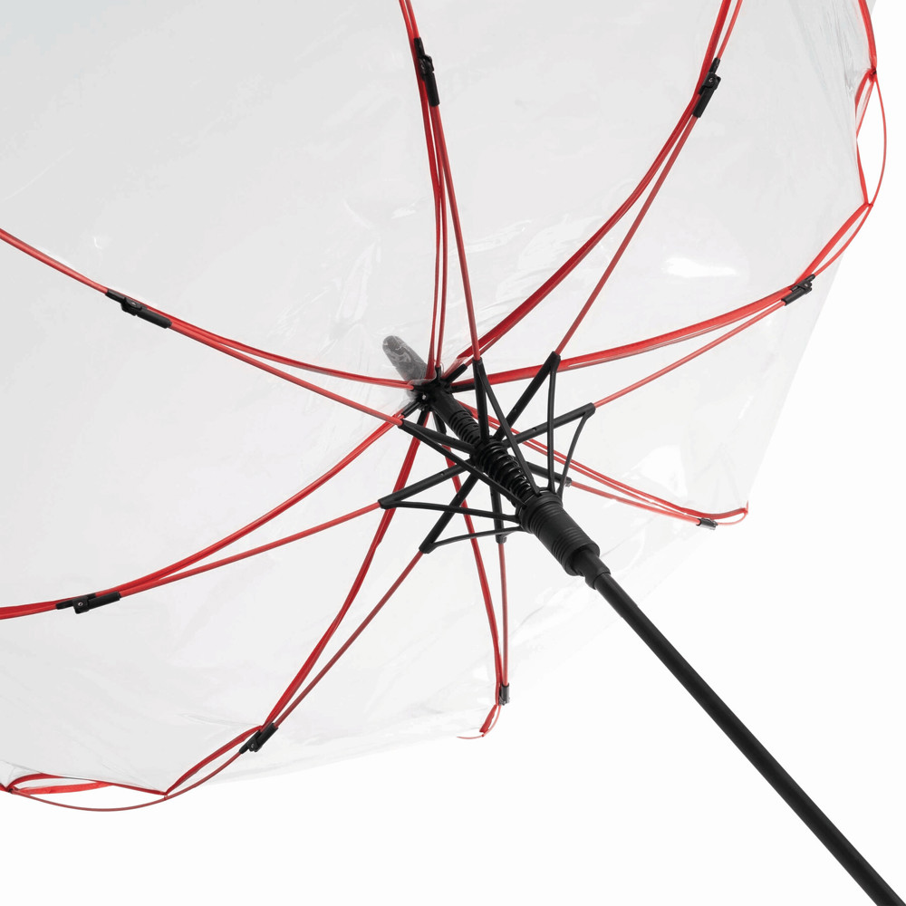 Automatische paraplu VIP: Metalen steel, gekleurde glasfiber baleinen met metalen tips, kunststof punt en handvat met inklapknop, transparant doek met gekleurde rand, sluitband en drukknop