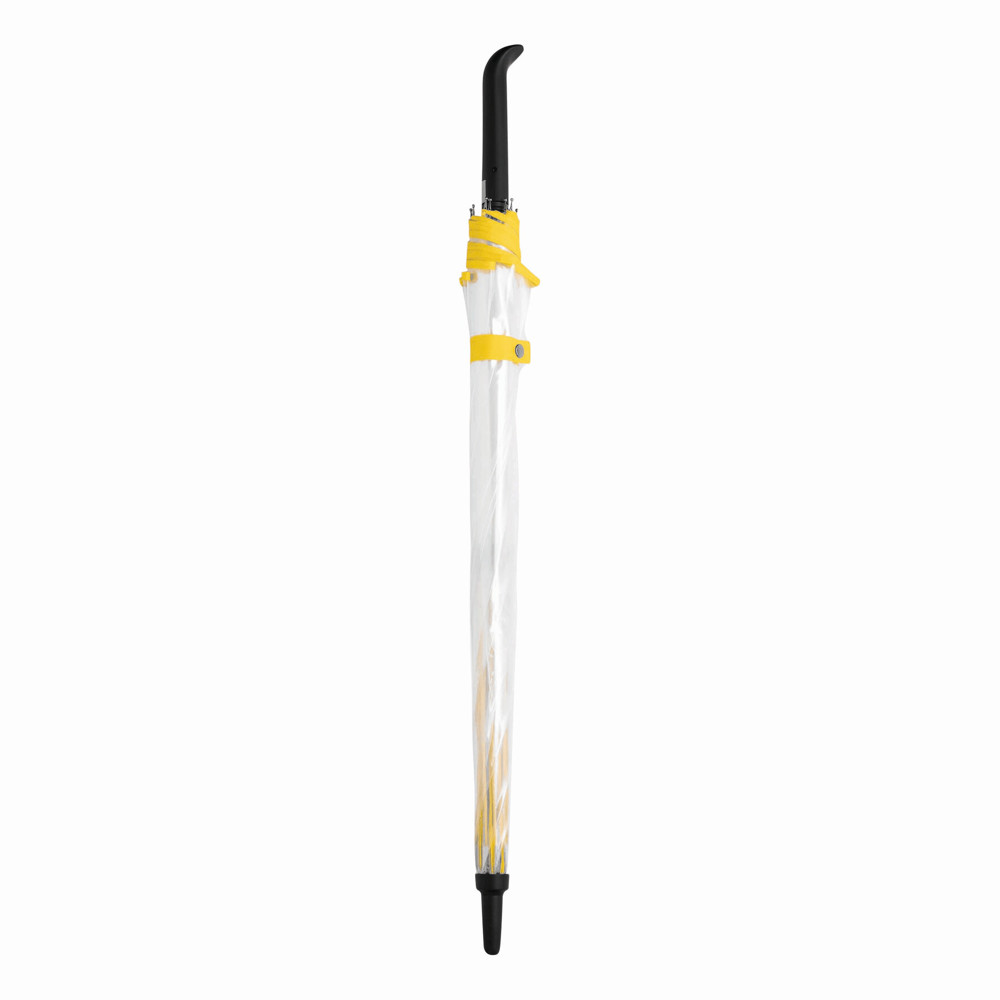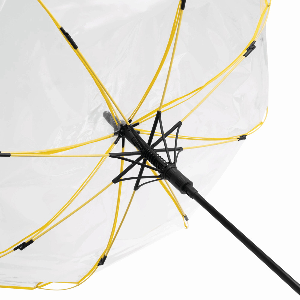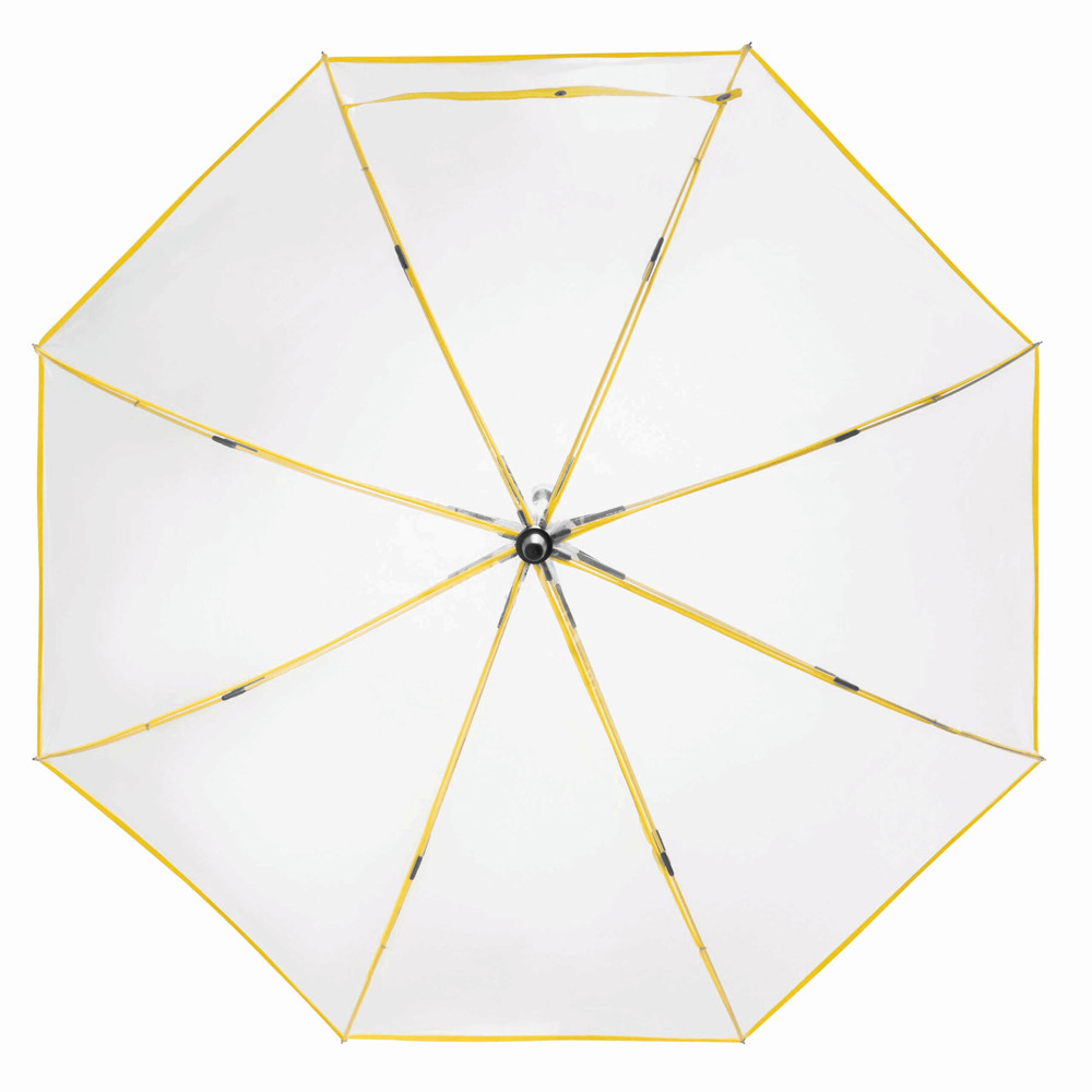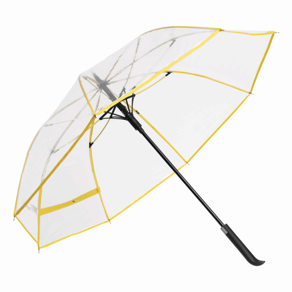 Automatische paraplu VIP: Metalen steel, gekleurde glasfiber baleinen met metalen tips, kunststof punt en handvat met inklapknop, transparant doek met gekleurde rand, sluitband en drukknop