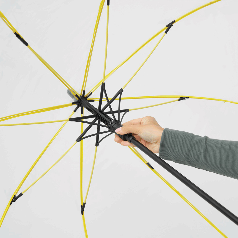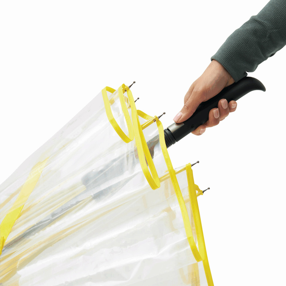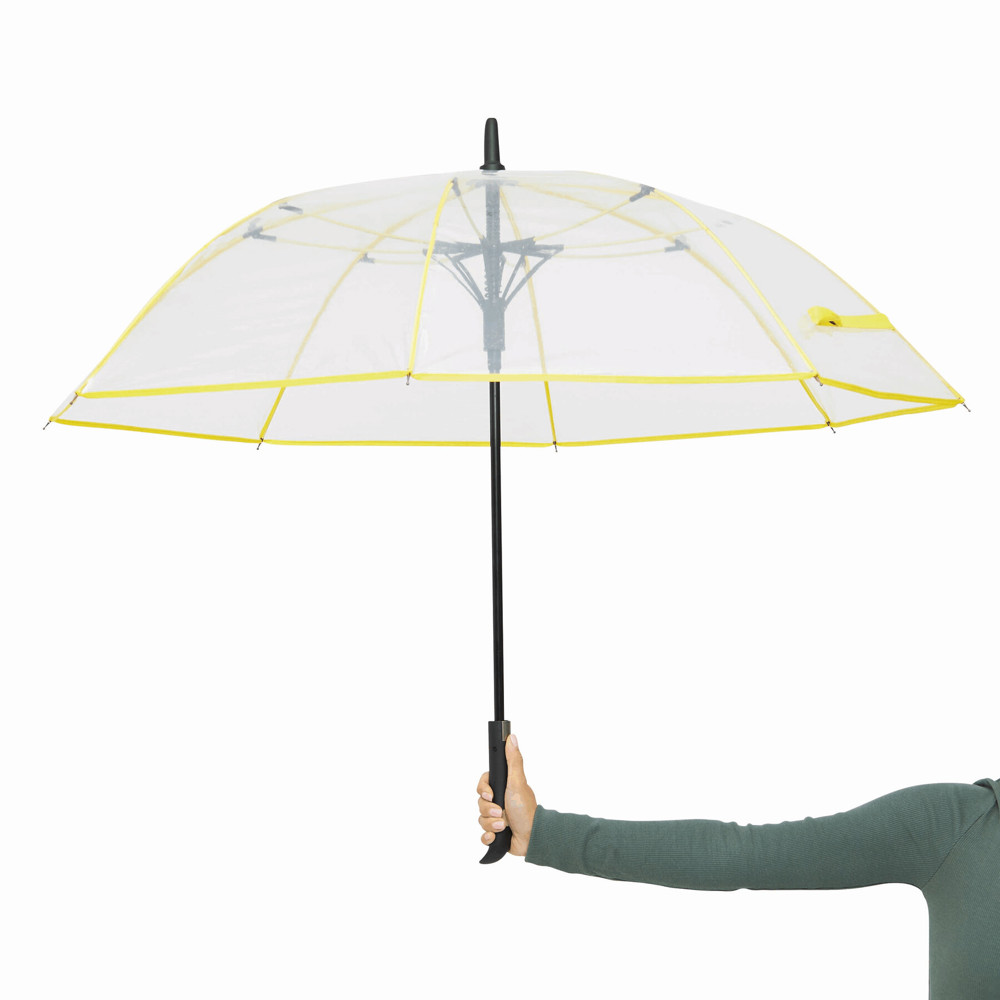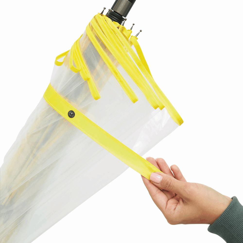 Automatische paraplu VIP: Metalen steel, gekleurde glasfiber baleinen met metalen tips, kunststof punt en handvat met inklapknop, transparant doek met gekleurde rand, sluitband en drukknop