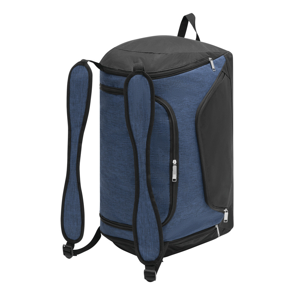 Sporttas 2 IN 1, met schoenenzijvak: groot hoofdvak met rits, voorvak met rits, 2 zijvakken met rits, 1 extra draagband, verstevigde handvatten, ook te gebruiken als rugtas