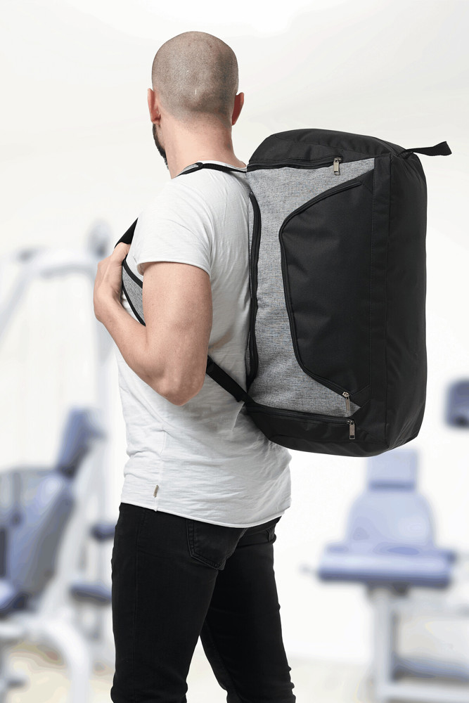 Sporttas 2 IN 1, met schoenenzijvak: groot hoofdvak met rits, voorvak met rits, 2 zijvakken met rits, 1 extra draagband, verstevigde handvatten, ook te gebruiken als rugtas