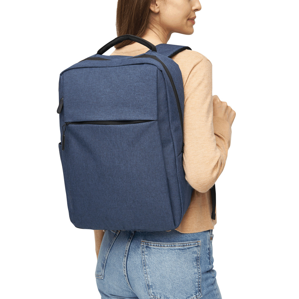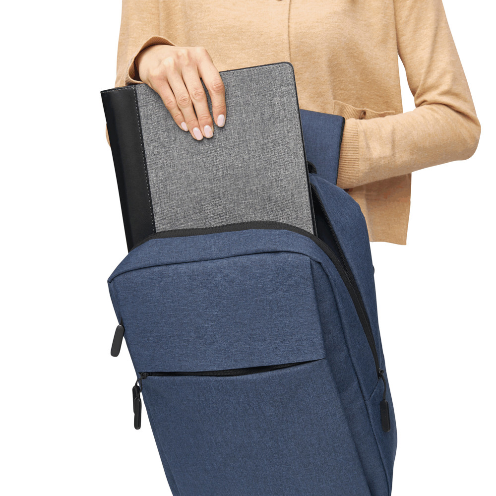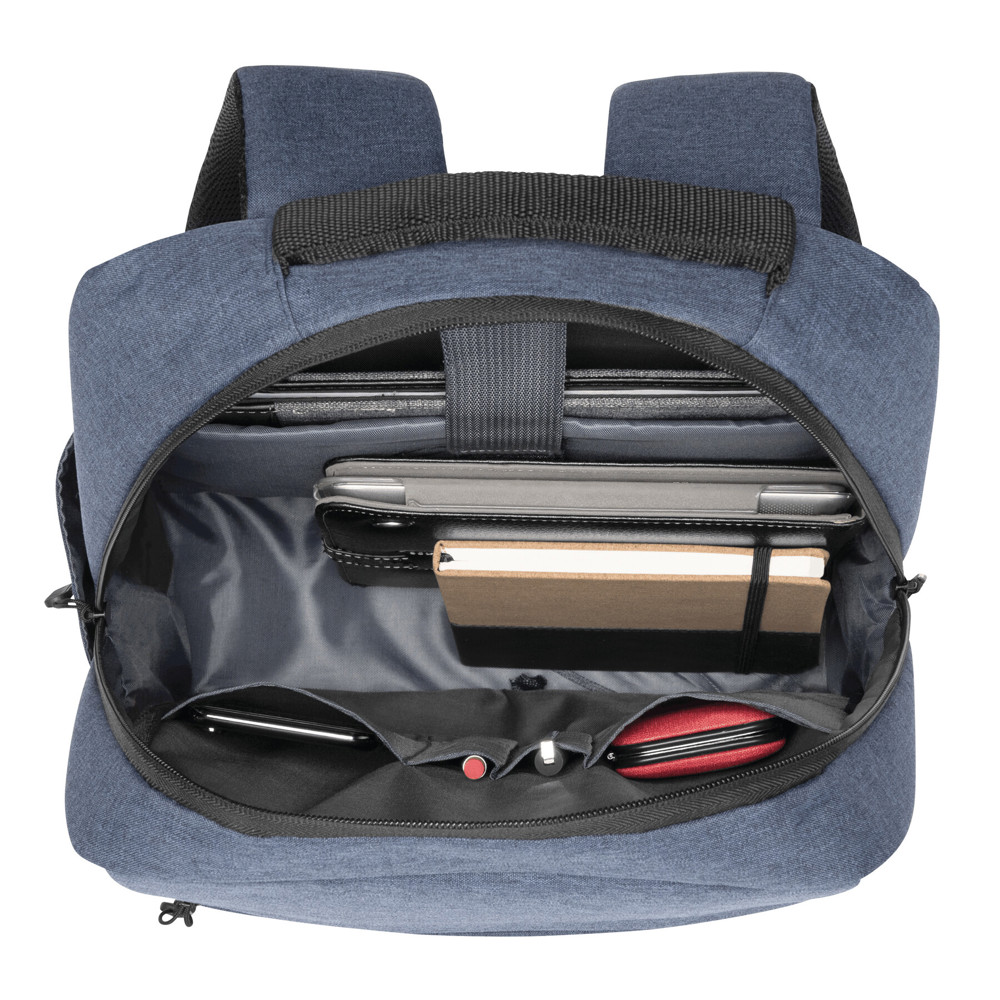 Rugtas JUST: 1 horizontaal en 1 verticaal voorvak met rits, 1 hoofdvak met rits met gefoamd binnenvak voor laptop of tablet en organiser, 1 insteekzijvak, versterkte handvatten en gefoamde schouderbanden
