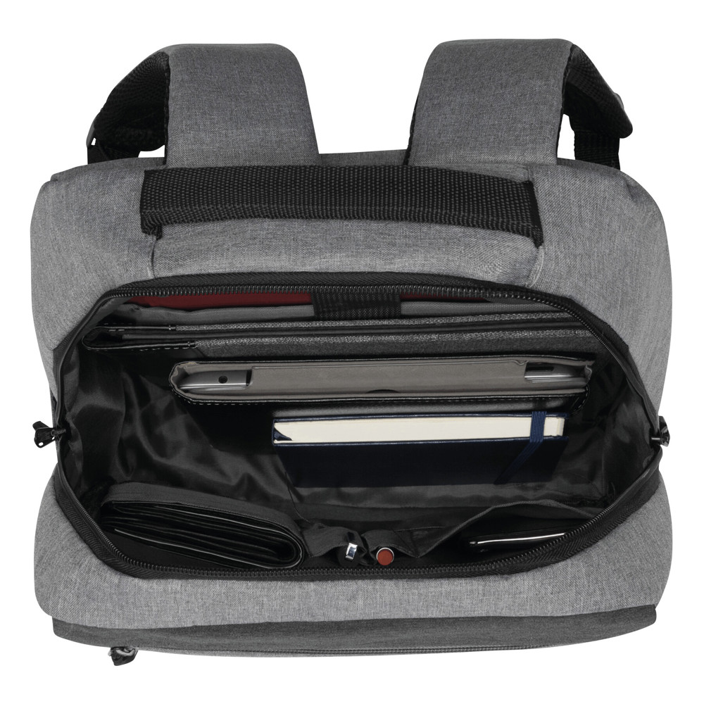 Rugzak NORDIC LINE: 2 ritsvakken aan de voorkant, hoofdvak met ritssluiting met gefoamd binnenvak voor laptop of tablet, organiser met 4 insteekvakken, 1 insteekvak aan 1 zijkant, gefoamde schouderbanden en rugvlak.