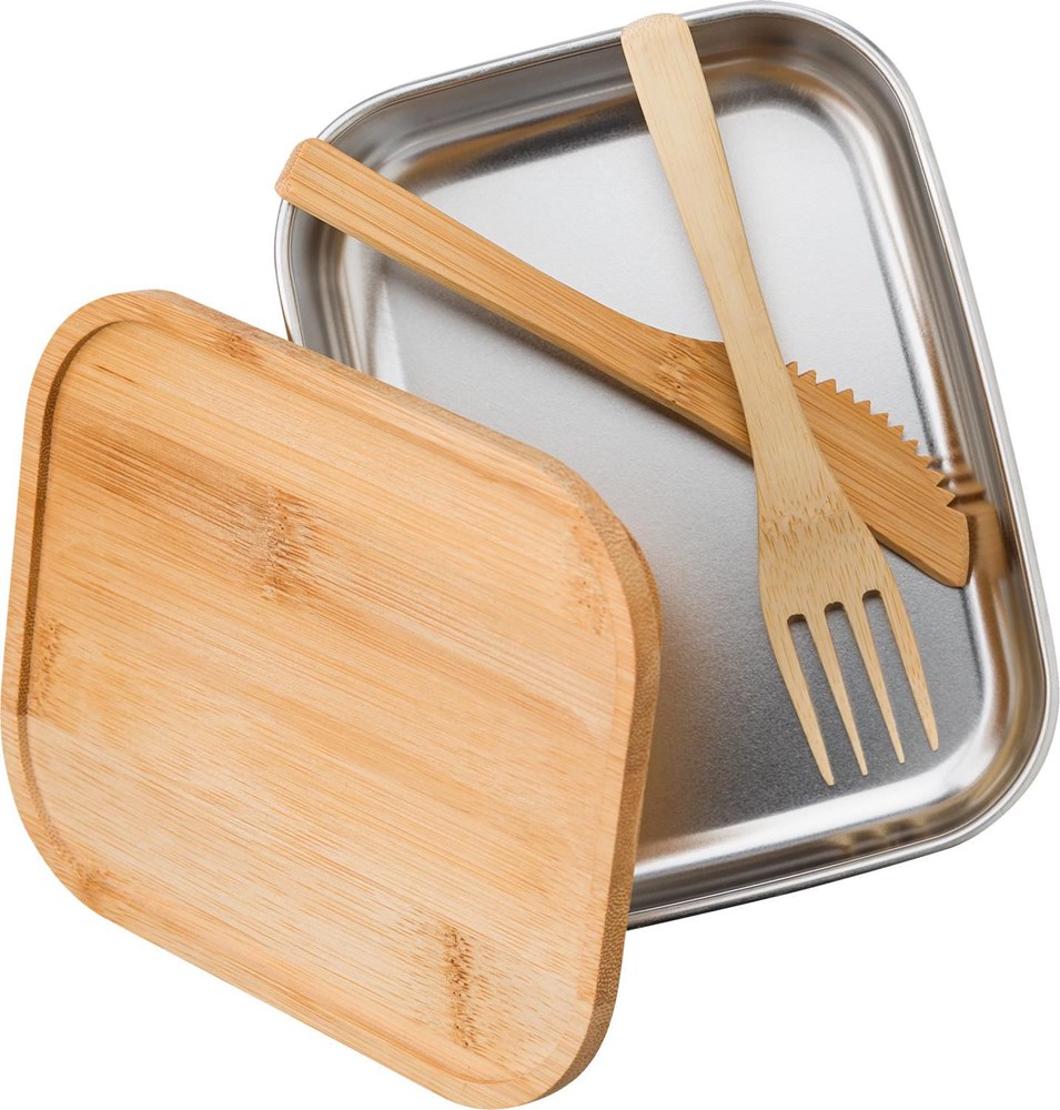 Roestvrijstalen lunchbox (600 ml). Met bamboe deksel en twee bestekstukken (vork en mes). Inclusief nylon band.