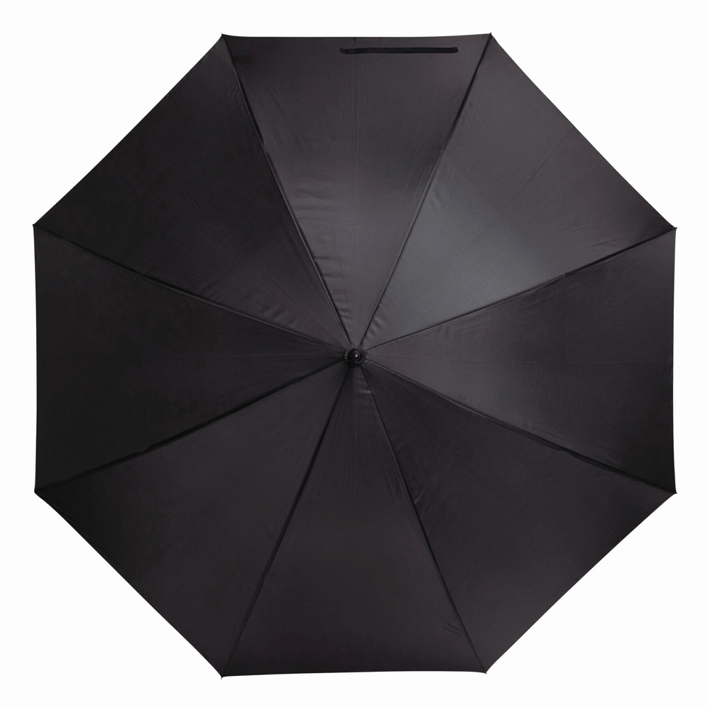Automatische golfparaplu SUBWAY met zwarte metalen steel, baleinen en tips, zwart gebogen EVA handvat klittenband sluiting en polyester-pongee cover met waterafstotende coating.