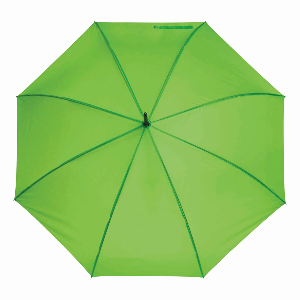 Automatische golfparaplu SUBWAY met zwarte metalen steel, baleinen en tips, zwart gebogen EVA handvat klittenband sluiting en polyester-pongee cover met waterafstotende coating.