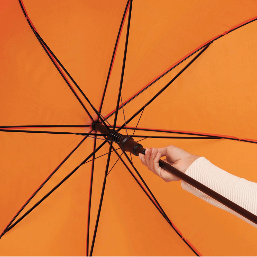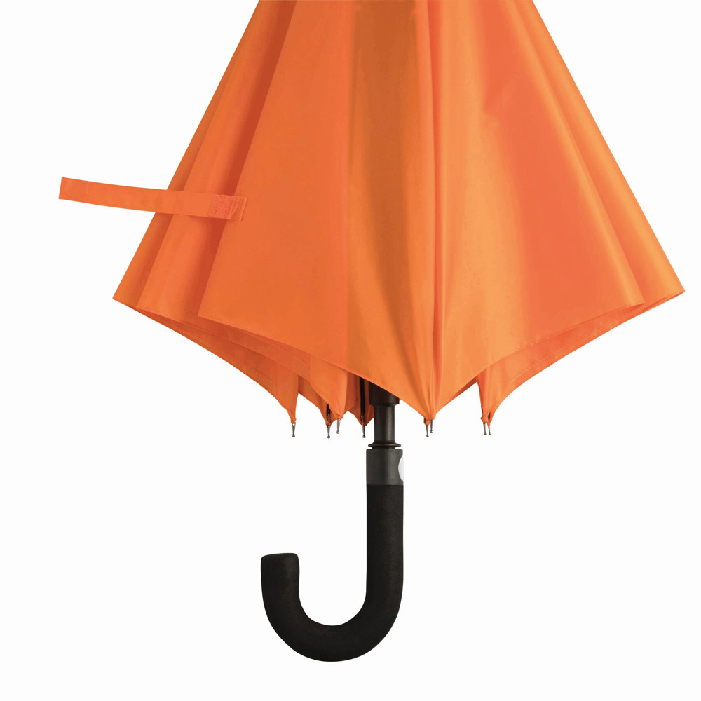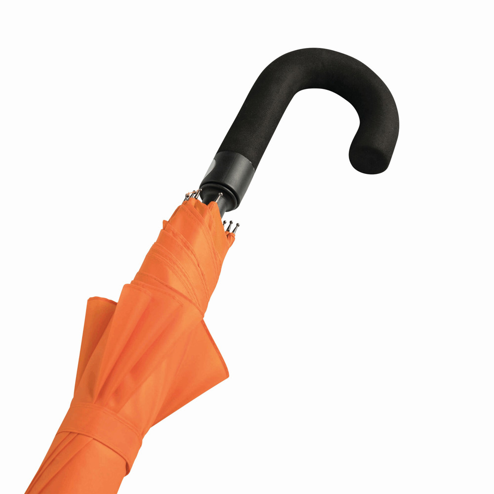 Automatische golfparaplu SUBWAY met zwarte metalen steel, baleinen en tips, zwart gebogen EVA handvat klittenband sluiting en polyester-pongee cover met waterafstotende coating.