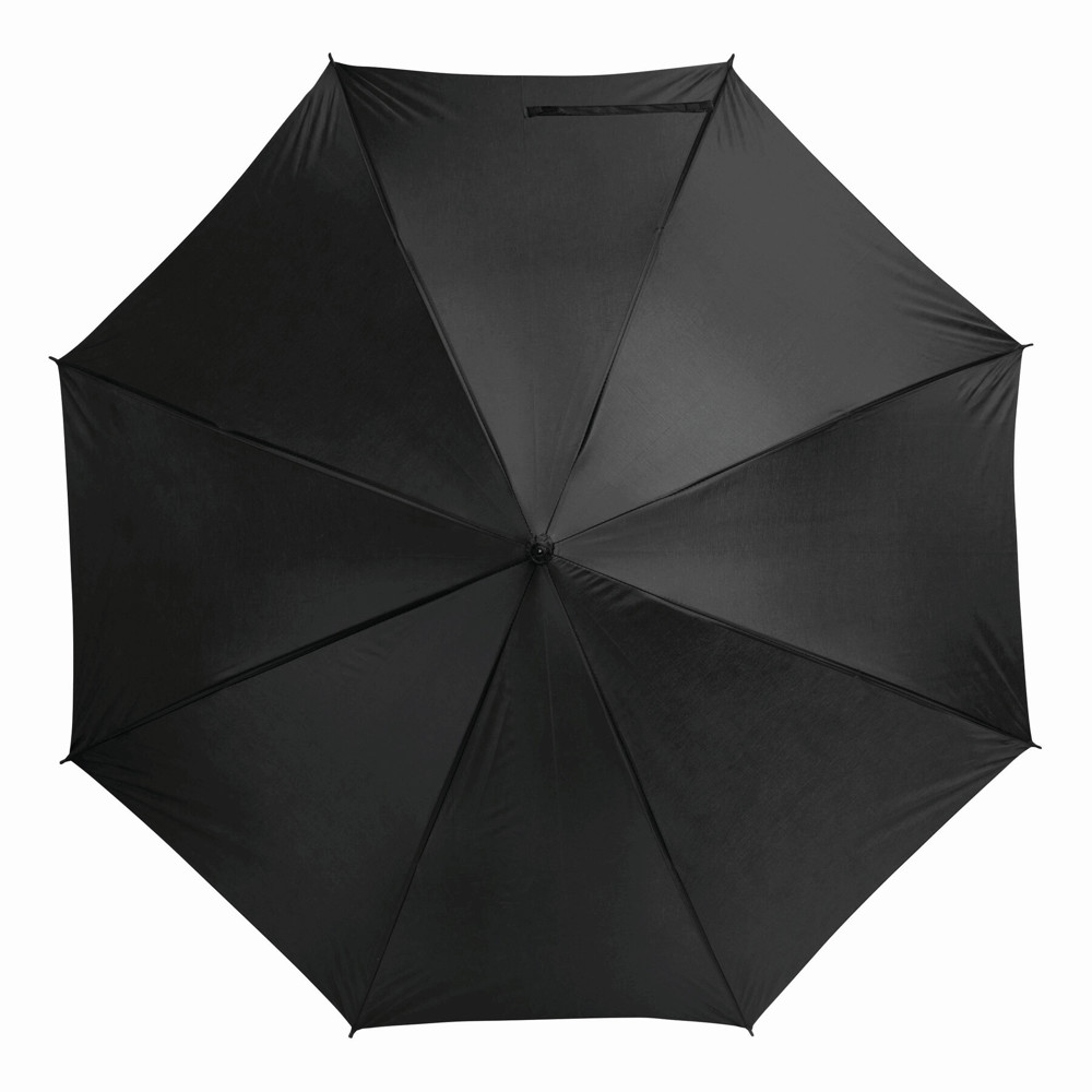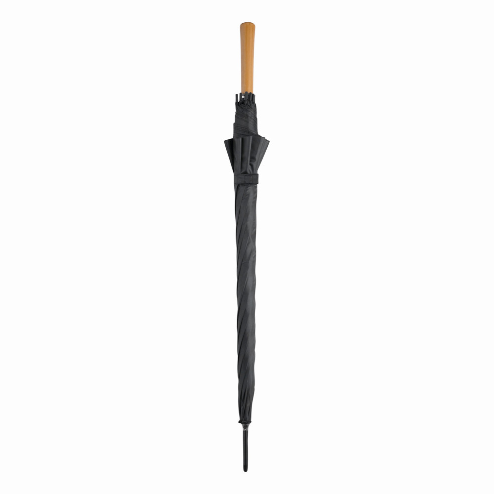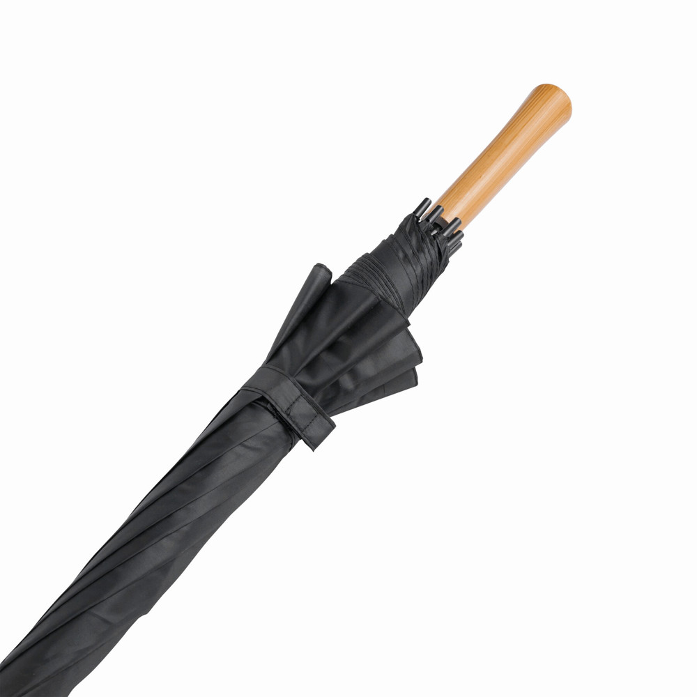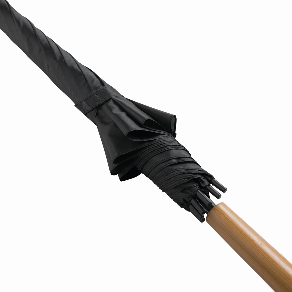 Automatisch te openen paraplu LIMBO: metalen steel en baleinen, matching kleurige kunststof tips, handvat in hout-look, polyester doek, sluitband met klittenband.