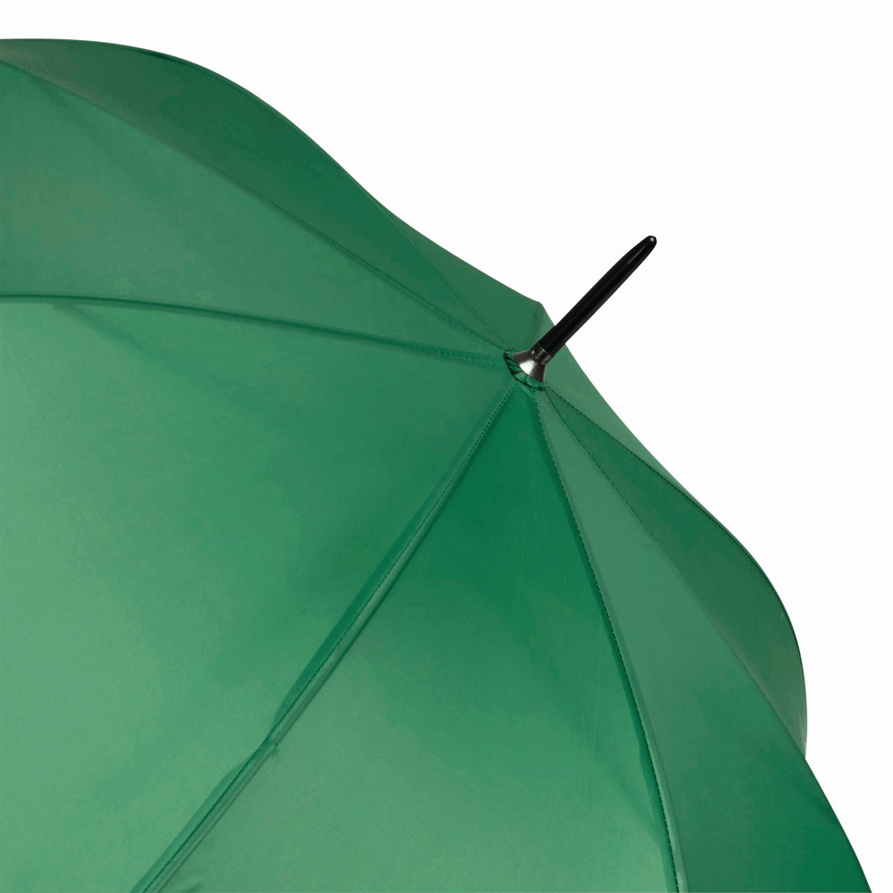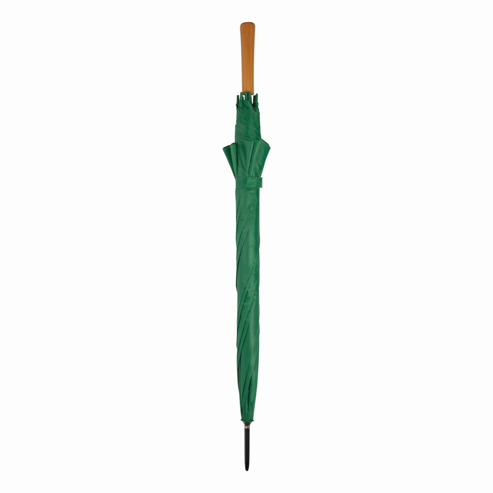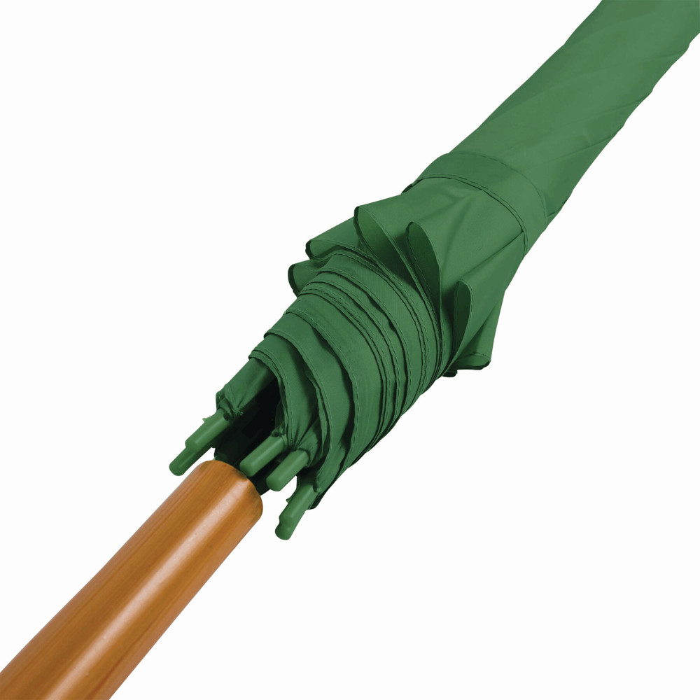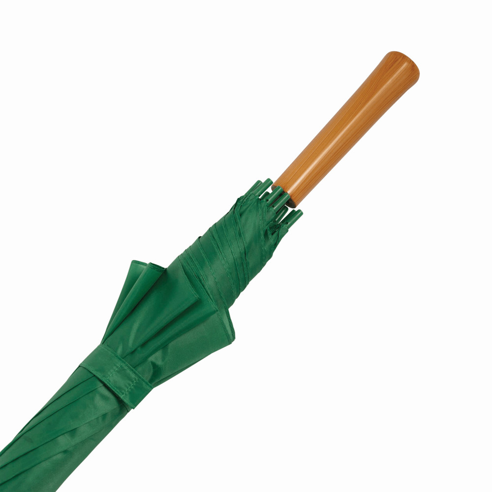 Automatisch te openen paraplu LIMBO: metalen steel en baleinen, matching kleurige kunststof tips, handvat in hout-look, polyester doek, sluitband met klittenband.