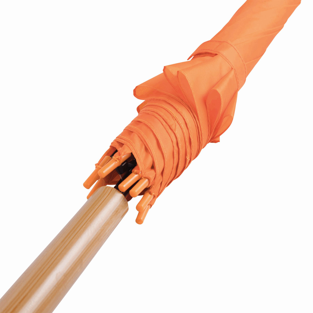 Automatisch te openen paraplu LIMBO: metalen steel en baleinen, matching kleurige kunststof tips, handvat in hout-look, polyester doek, sluitband met klittenband.