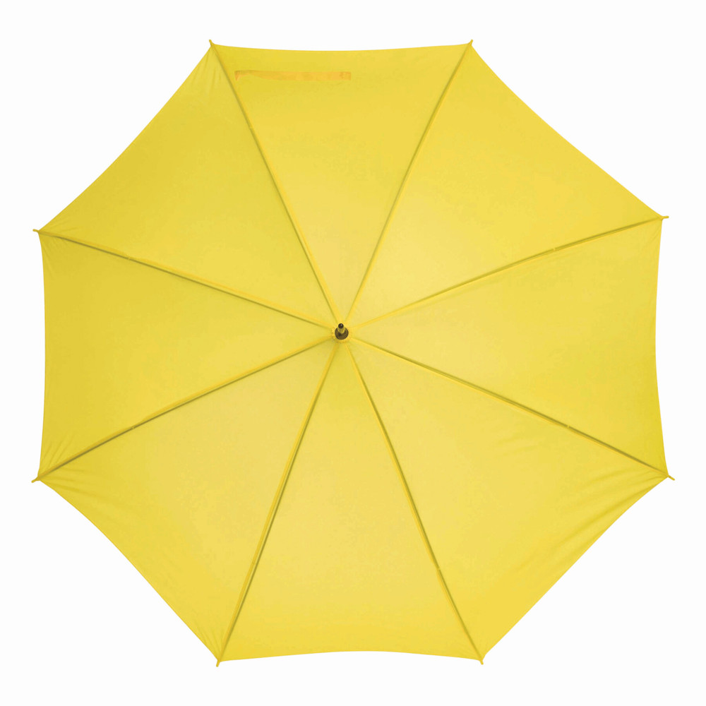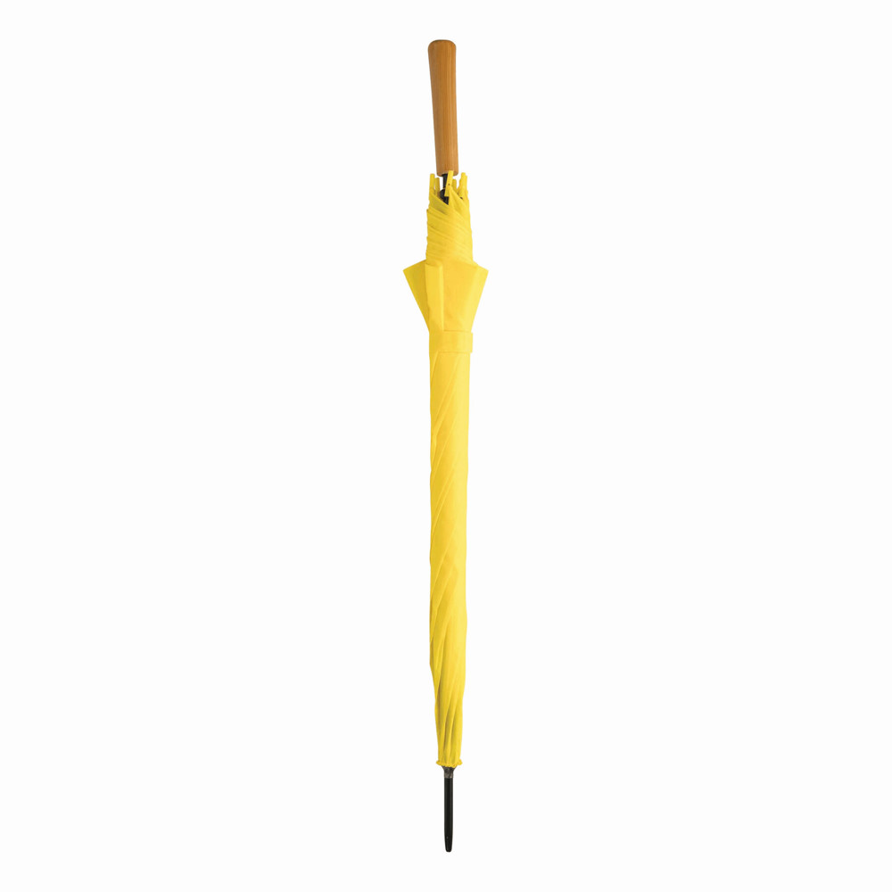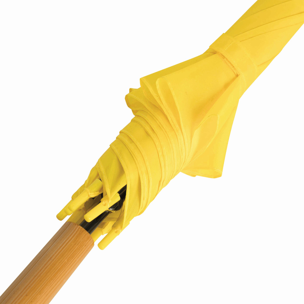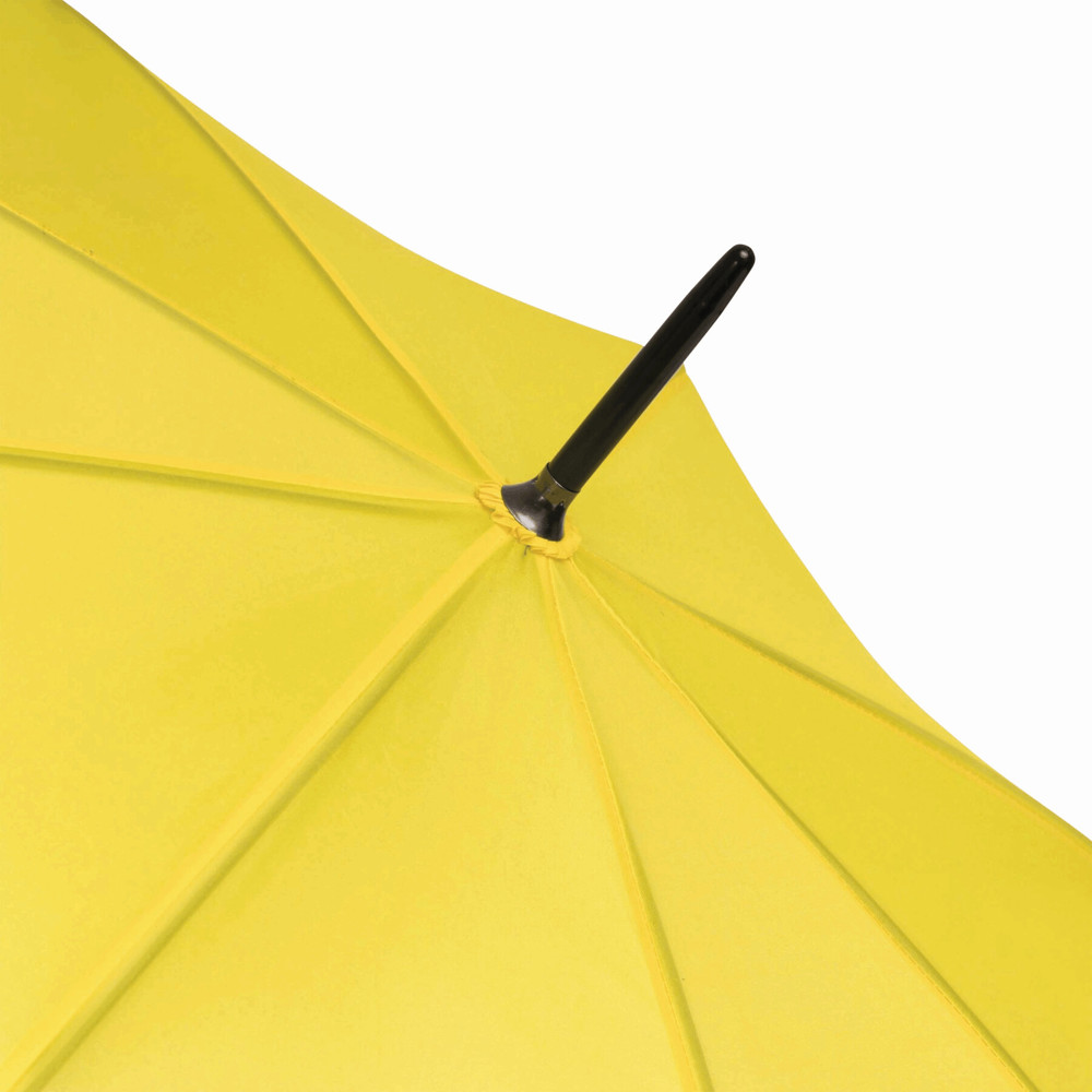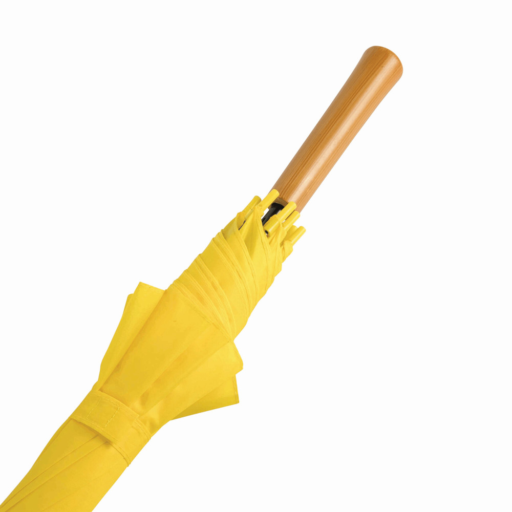 Automatisch te openen paraplu LIMBO: metalen steel en baleinen, matching kleurige kunststof tips, handvat in hout-look, polyester doek, sluitband met klittenband.