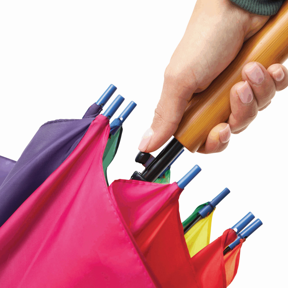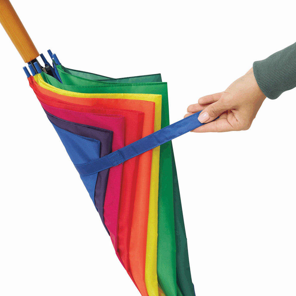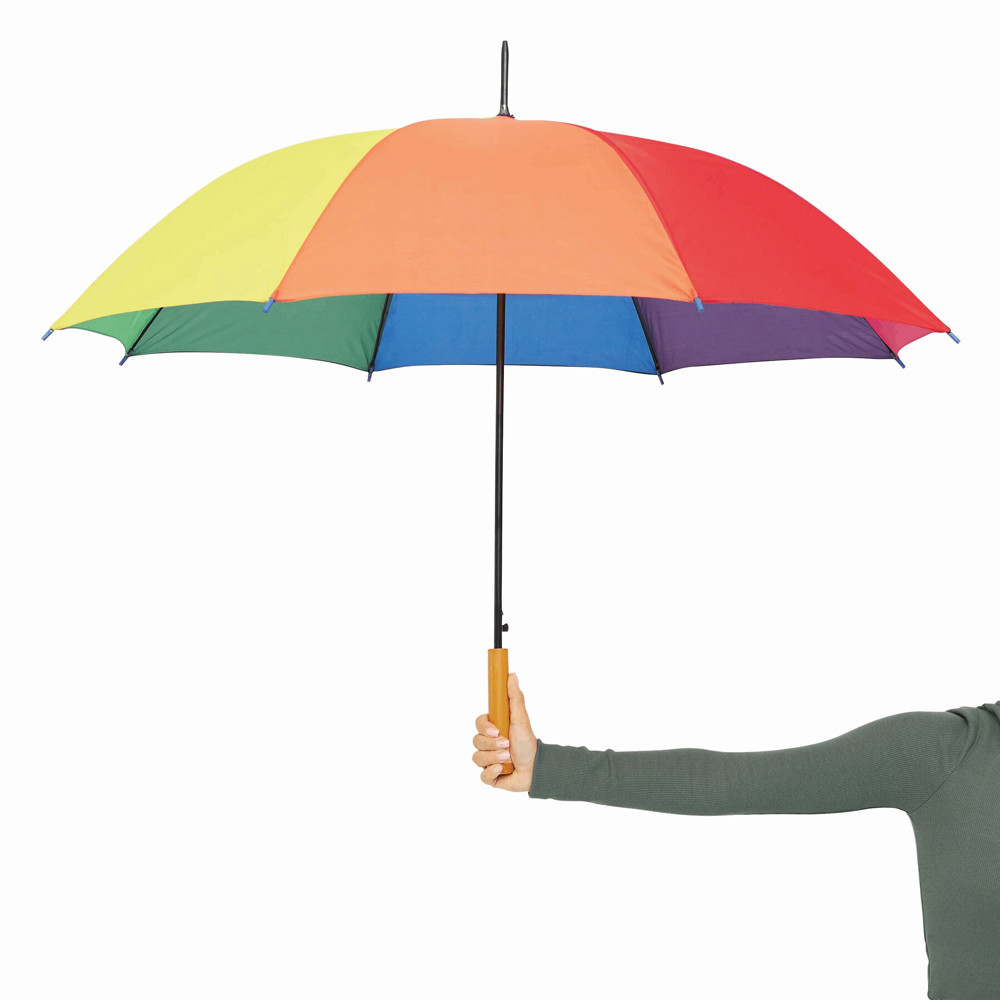 Automatisch te openen paraplu LIMBO: metalen steel en baleinen, matching kleurige kunststof tips, handvat in hout-look, polyester doek, sluitband met klittenband.
