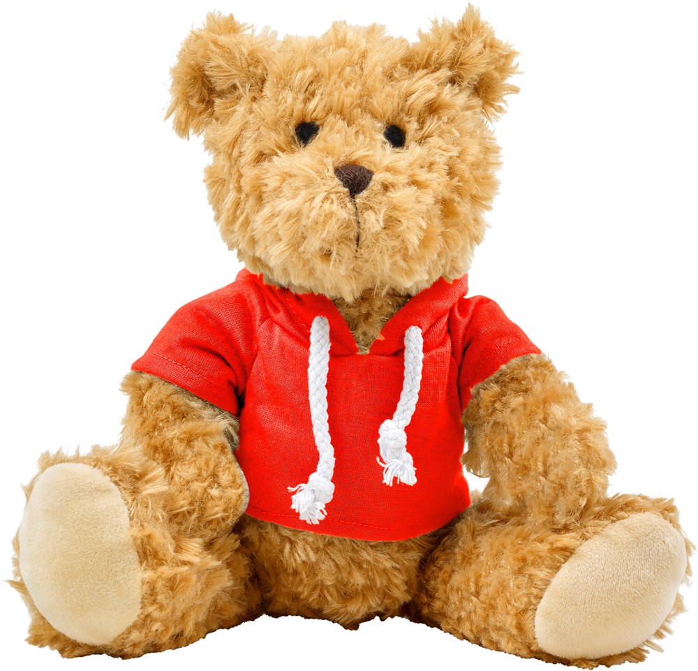 Pluche teddybeer, met geborduurde ogen. De beer draagt een hoodie die in meerdere kleuren leverbaar is. De hoodie heeft altijd een wit koord.