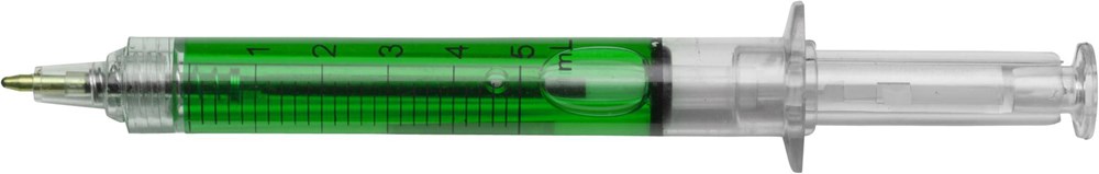 Kunststof balpen, zwartschrijvend, model 'injectiespuit', met gekleurde vloeistof.