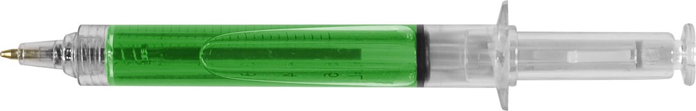 Kunststof balpen, zwartschrijvend, model 'injectiespuit', met gekleurde vloeistof.meer