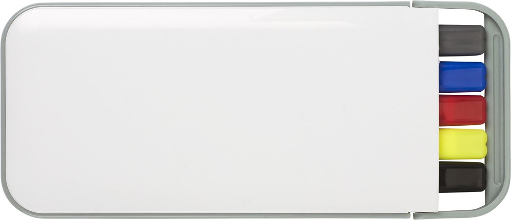 5-Delige pennenset in kunststof cassette. De pennenset bestaat uit 3 pennen (kleur van de vulling is de kleur van het dopje van de pen), 1 potlood en 1 markeerstift.