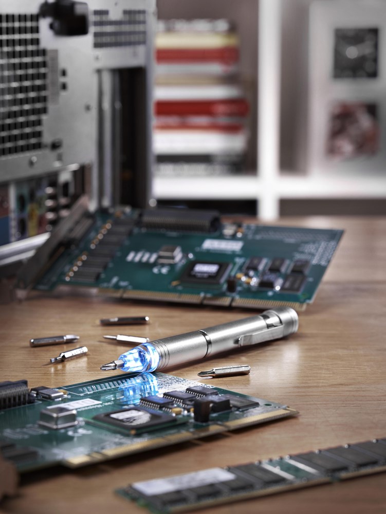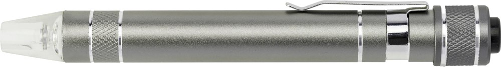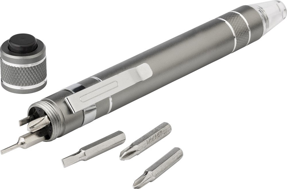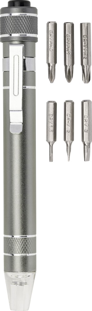 Aluminium schroevendraaierset in de vorm van een pen met lamp in de punt. Incl. 6 bitjes en incl. batterijen.