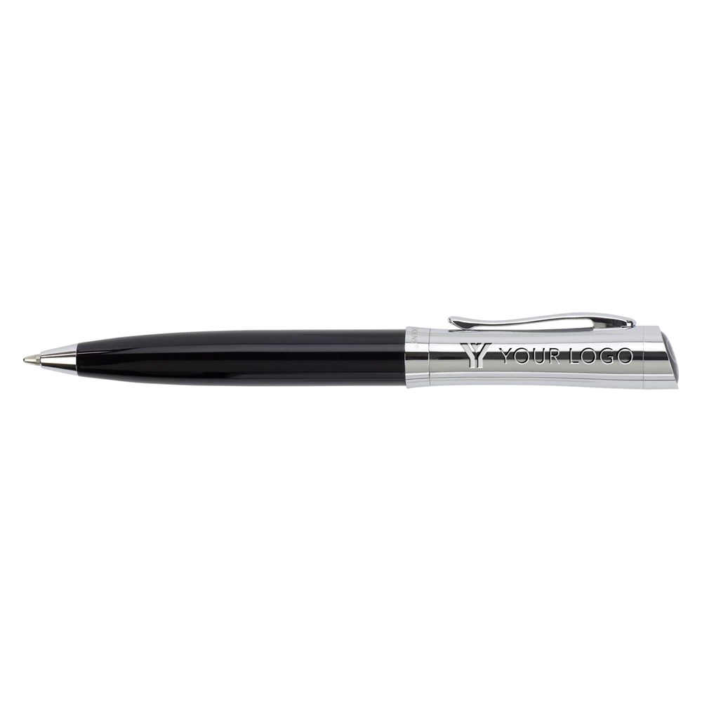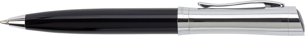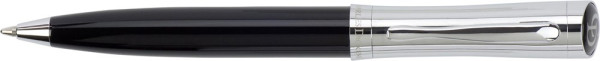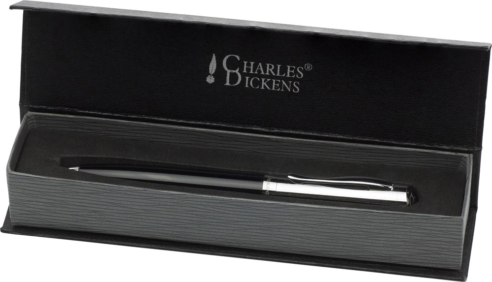 Metalen Charles Dickens® balpen met draaimechanisme, zwartschrijvend, met Charles Dickens doming op de top, in een zwarte kartonnen geschenkverpakking.