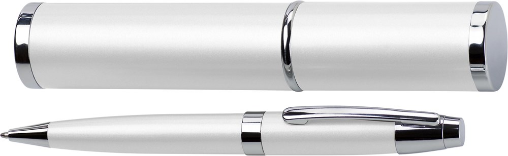 Metalen balpen, zwartschrijvend, met zilverkleurige accessoires, verpakt in een luxe koker. Prijs per stuk, afname per 50 stuks.