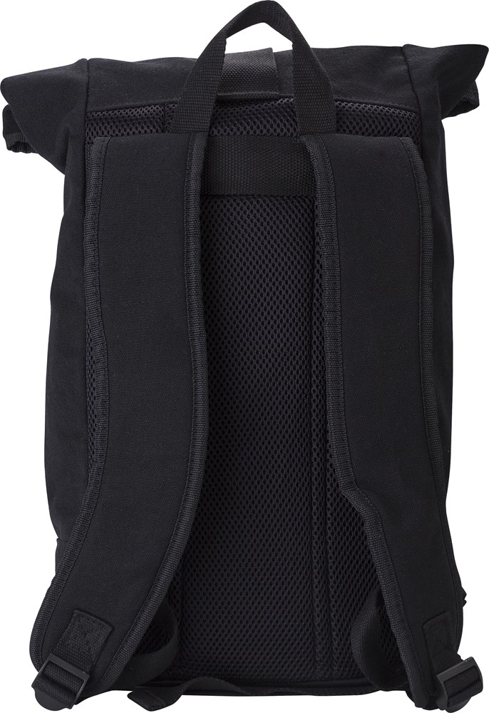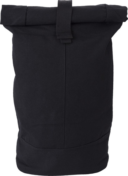 Polyester roll-top rugzak met klittenbandsluiting. 340 gram canvas met 210D rPET voering en mesh achterkant. Bodem is rPET PU.