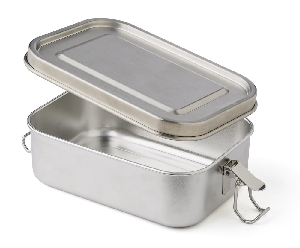 RVS (s/s304) lunchbox (750 ml) met gespsluiting. Individueel verpakt in een bruine kartonnen doos.