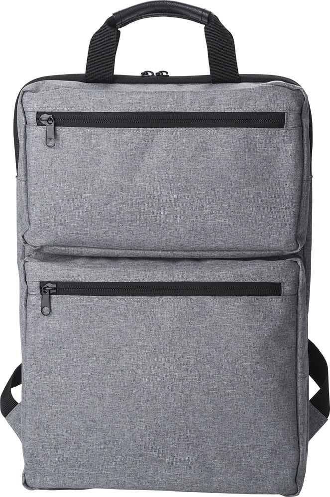 Polycanvas (300D) rugzak met twee buitenvakken met ritssluiting en een laptopvak aan de binnenkant (15 inch). Met gewatteerde schouderbanden en twee korte handgrepen aan de bovenkant.