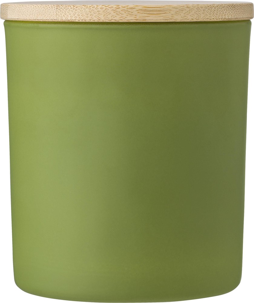 Glazen kaars met plantaardige was en een deksel van bamboe. De kaars bevat voornamelijk plantaardige was (carnaubawas) en heeft een brandtijd van ongeveer 33 uur. Vier geuren afhankelijk van de kleur van het glas: kaneel (rood), vanille (wit), sandelhout (zwart) en jasmijn (groen). Individueel verpakt in een witte koker.