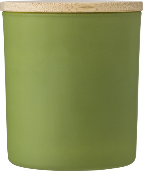 Glazen kaars met plantaardige was en een deksel van bamboe. De kaars bevat voornamelijk...meer